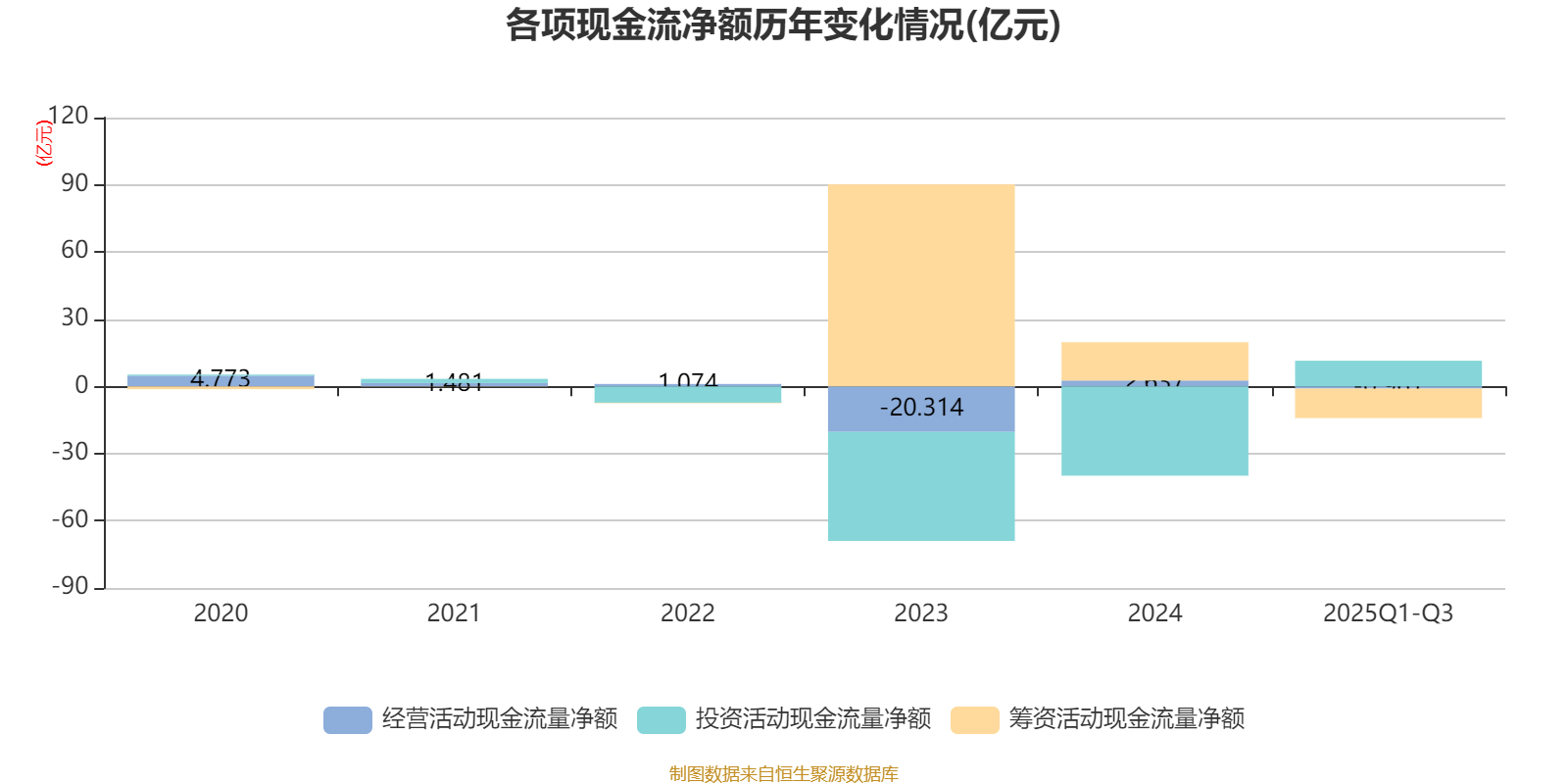2025年前三季度,公司经营活动现金流净额为-9612.72万元,同比减少6.59亿元;筹资活动现金流净额-13.16亿元,同比减少13.12亿元;投资活动现金流净额11.45亿元,上年同期为-28.7亿元。