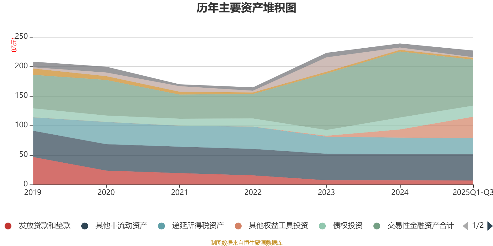 资产重大变化方面,截至2025年三季度末,公司交易性金融资产合计较上年末减少30.34%,占公司总资产比重下降12.49个百分点;其他权益工具投资较上年末增加159.12%,占公司总资产比重上升10.05个百分点;买入返售金融资产较上年末增加123.37%,占公司总资产比重上升1.27个百分点;货币资金较上年末减少66.53%,占公司总资产比重下降1.09个百分点。