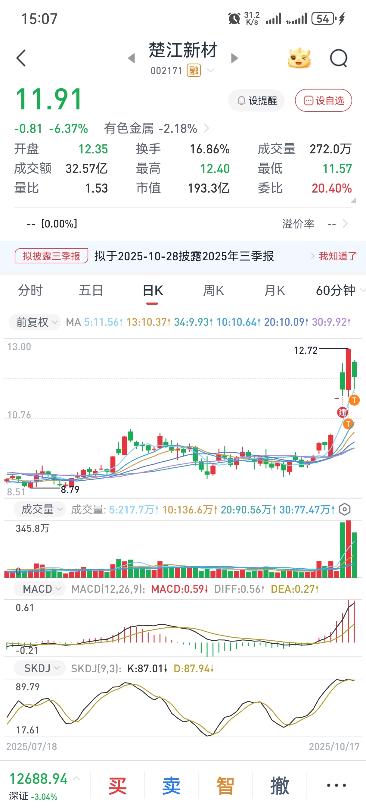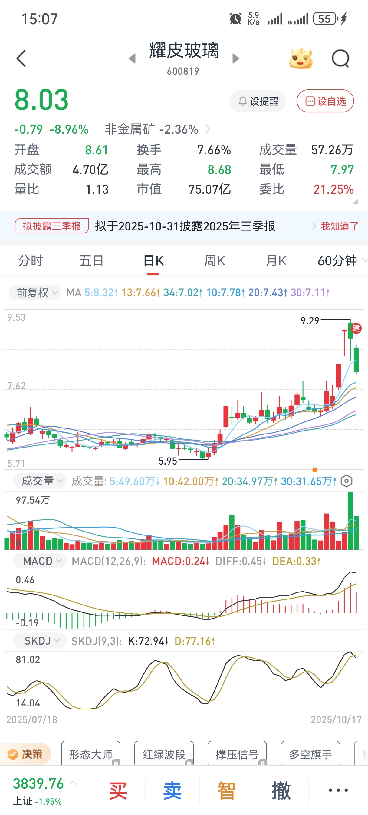 耀皮玻璃昨天如果不拉尾盘的话可能会考虑昨天就上车的,但是拉了尾盘就不能去了,今日8.05买入耀皮玻璃,楚江新材昨天只剩了半仓,今日继续高抛低吸,市场连续两天冰点,下周一或者下周二肯定有反弹的需求,但是要注意快进快出,因为已经到了三季报披露时间,还有就是中美双方有很多不稳定的事随时可能发生,大盘也连续破位,大家一定要注意风险,注意仓位管理。