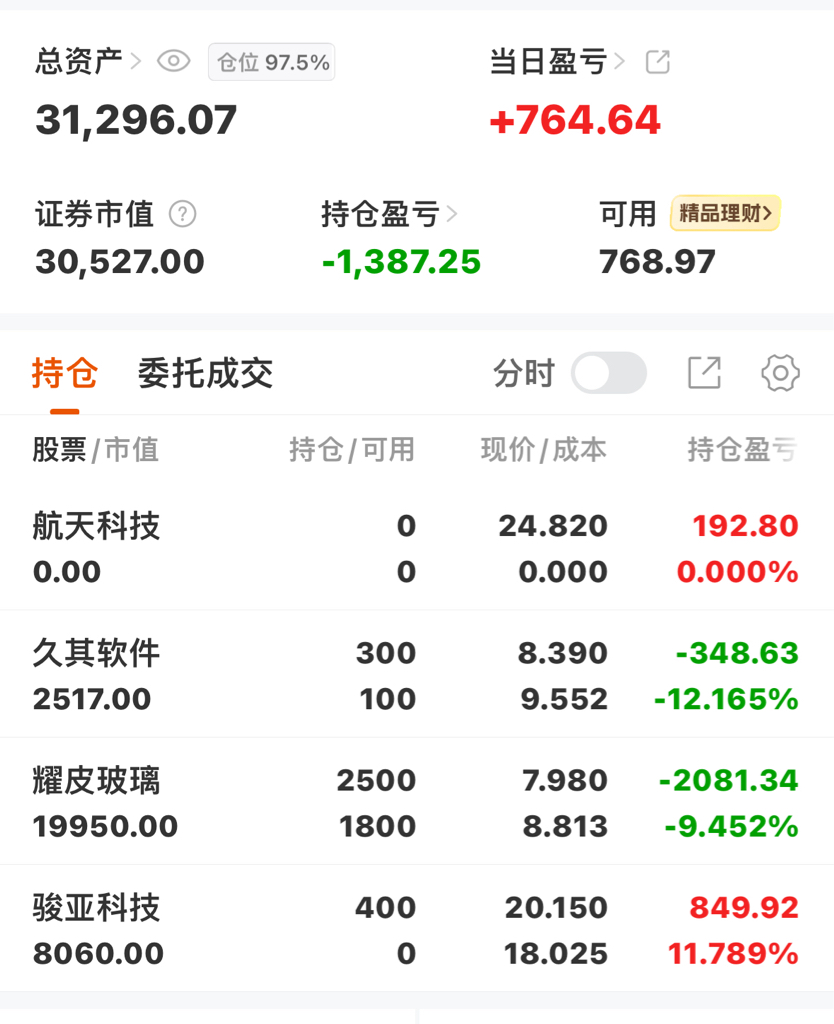 2025.12.9航天科技.止盈耀皮玻璃.久其软件.加仓骏亚科技.新开仓位超过心