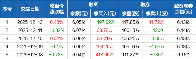 隧道股份:融资净偿还197.02万元,融资余额6.05亿元(12-12)