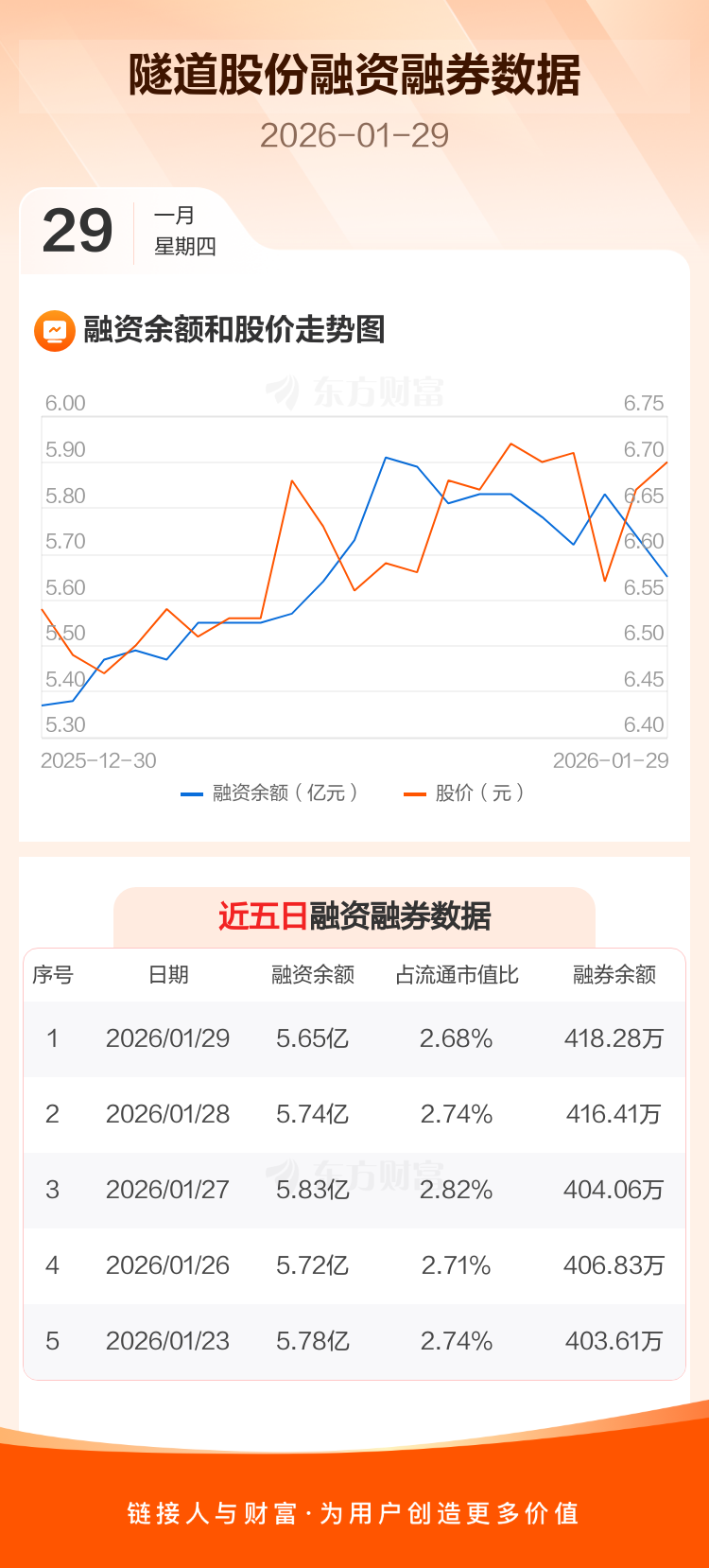 交易所最新数据显示,隧道股份于2026年1月29日获融资买入2627.40万元,融资偿还3478.75万元,当日融资净偿还851.34万元。目前,该股融资余额5.65亿,占流通市值比例为2.68%。