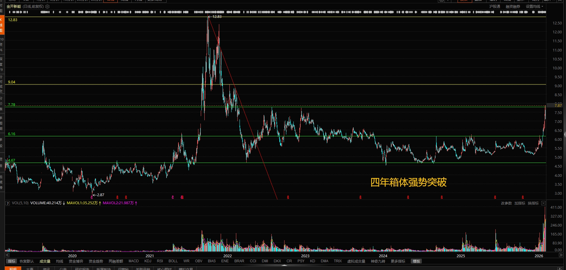 箱体翻倍,看到14,300亿市值。4年箱体强势突破