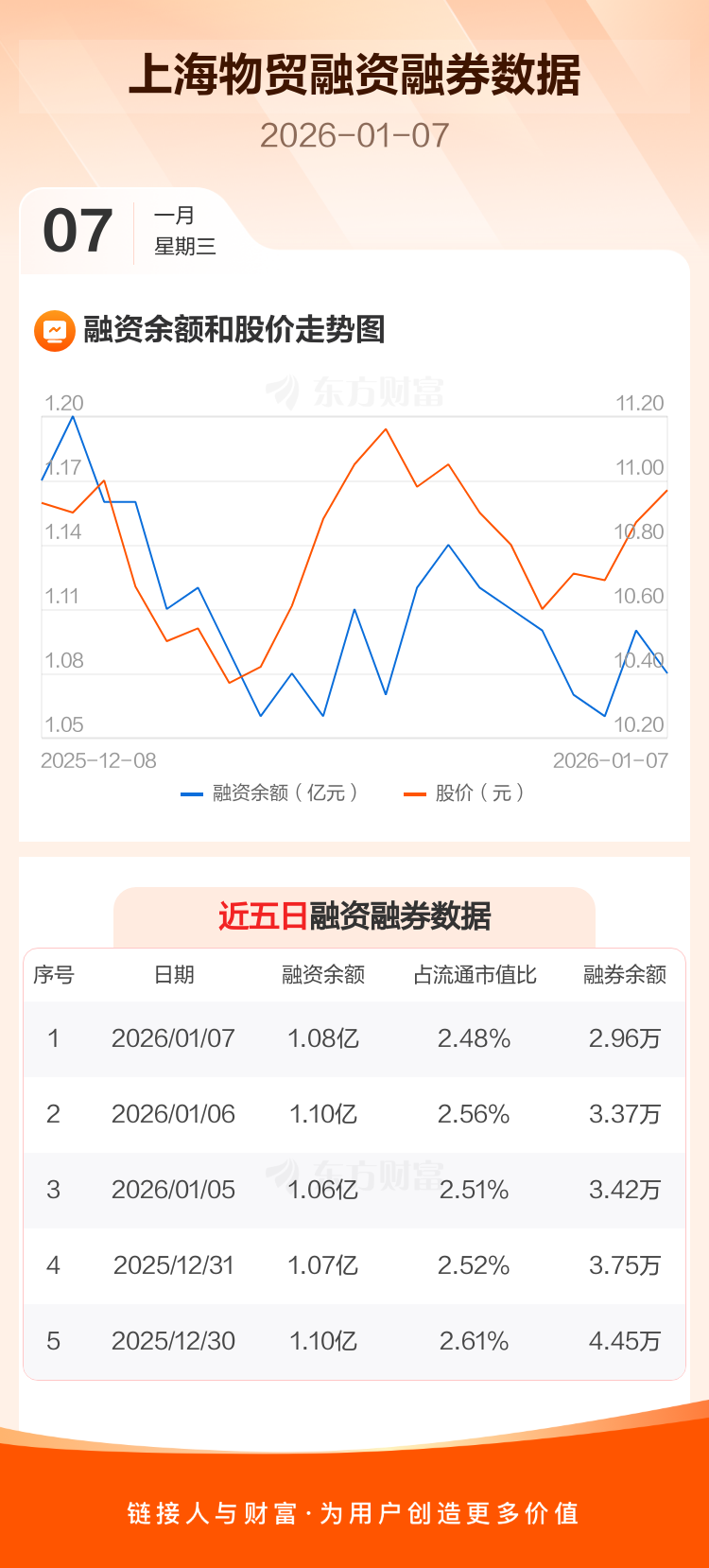 交易所最新数据显示,上海物贸于2026年1月7日获融资买入834.60万元,融资偿还1075.80万元,当日融资净偿还241.2万元。目前,该股融资余额1.08亿,占流通市值比例为2.48%。