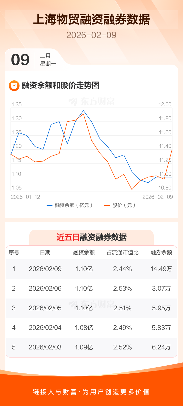 交易所最新数据显示,上海物贸于2026年2月9日获融资买入1393.82万元,融资偿还1345.79万元,当日融资净买入48.03万元。目前,该股融资余额1.10亿,占流通市值比例为2.44%。