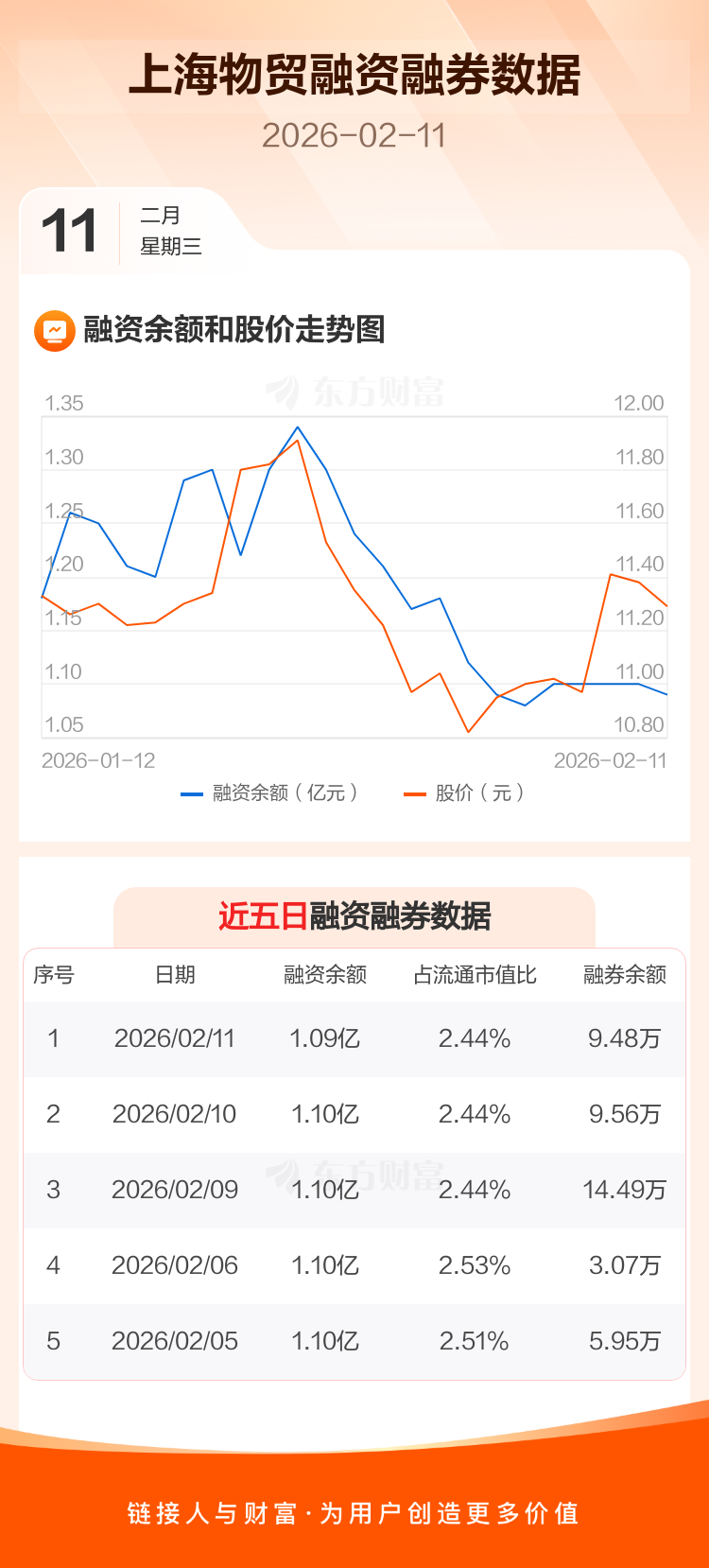 交易所最新数据显示,上海物贸于2026年2月11日获融资买入313.82万元,融资偿还403.61万元,当日融资净偿还89.79万元。目前,该股融资余额1.09亿,占流通市值比例为2.44%。
