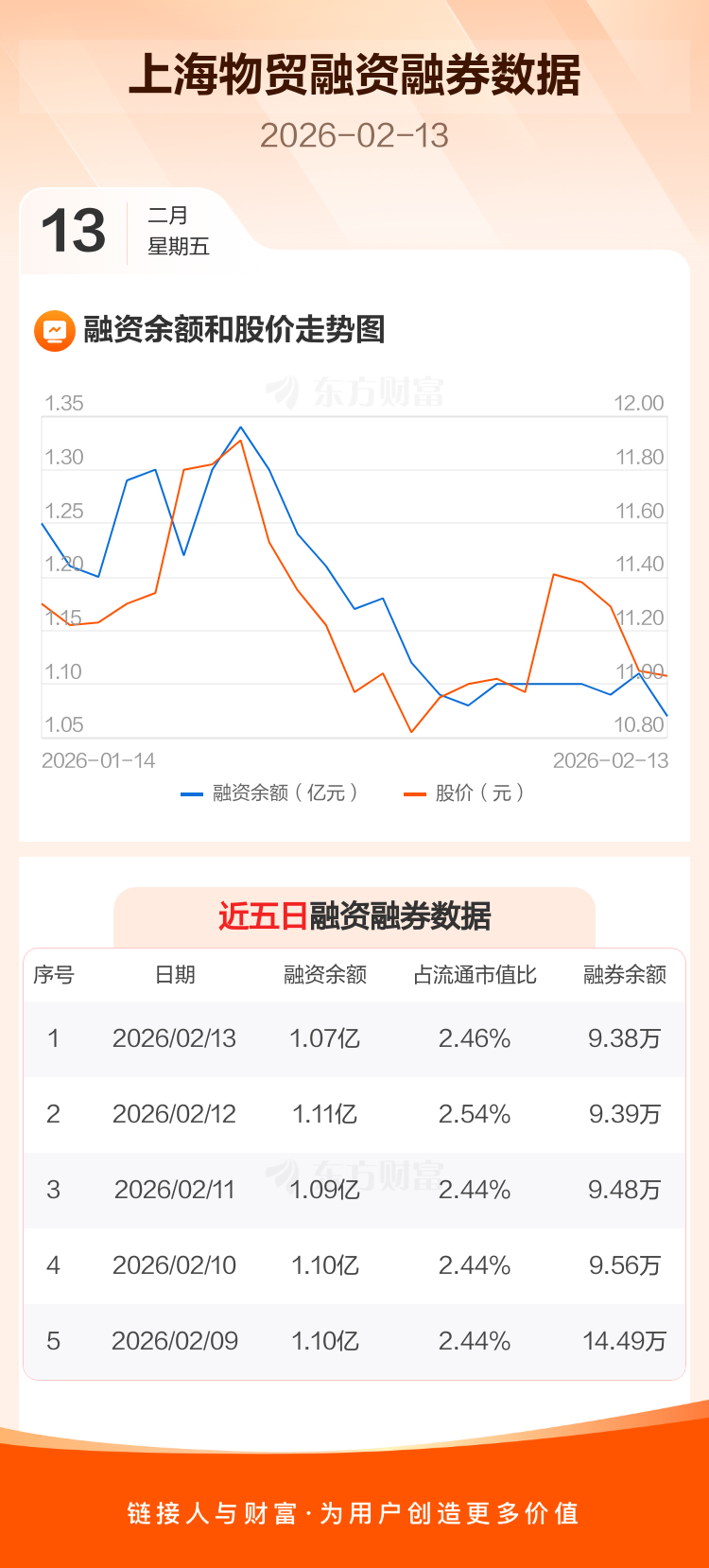 交易所最新数据显示,上海物贸于2026年2月13日获融资买入150.49万元,融资偿还511.75万元,当日融资净偿还361.26万元。目前,该股融资余额1.07亿,占流通市值比例为2.46%。