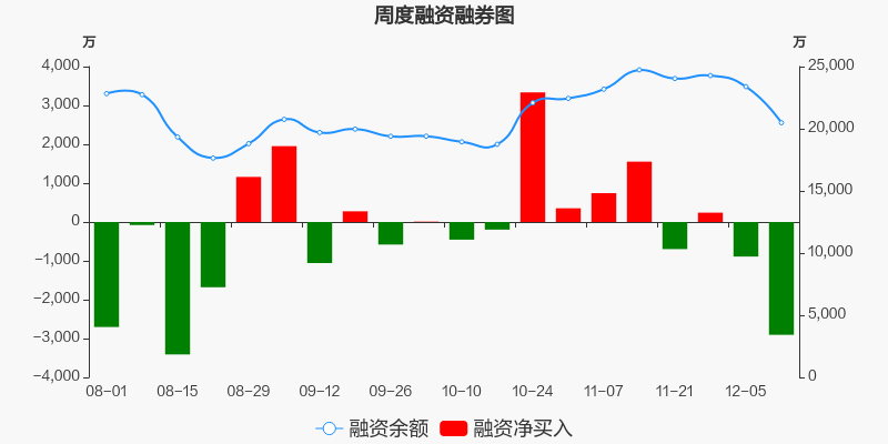 兰生股份本周(2025/12/08-2025/12/12)累计跌幅达8.02%,截至12月12日最新股价报收10.55元。从增量上来看,12月8日至12月12日融资买入交易规模4634.88万元,融资偿还规模7538.71万元,期内融资净偿还2903.84万元。从存量上来看,截止12月14日,兰生股份融资融券余额2.05亿元,其中融资余额规模2.05亿元,融券余额规模4220元。