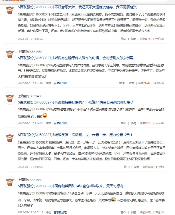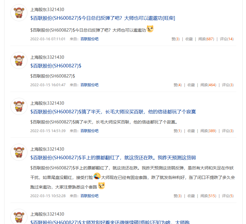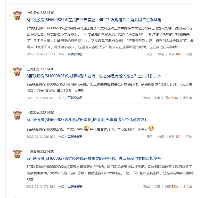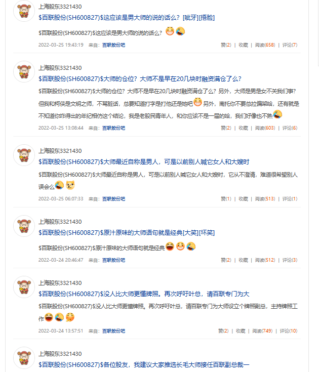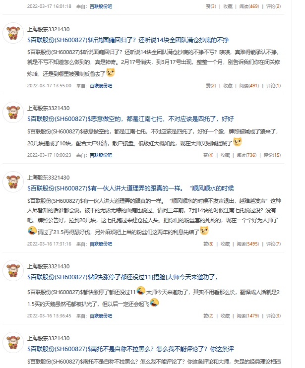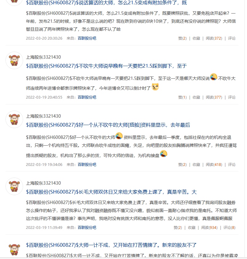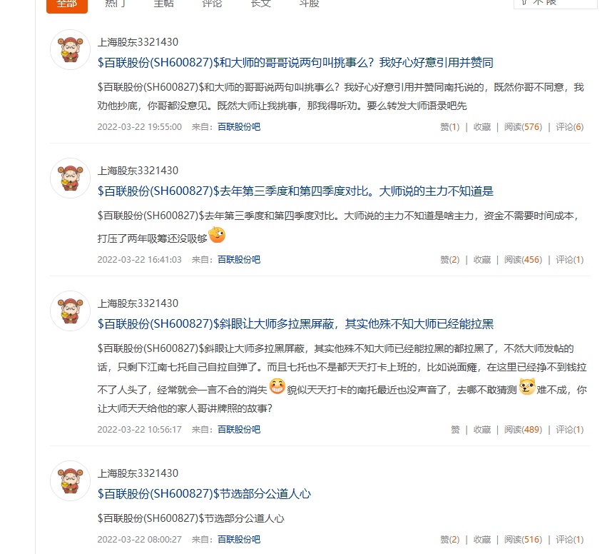 $百联股份(SH600827)$ 2022年的3月15到6月4日这一段,上海股东3321430开启疯癫模式,那时候才是最精彩的,一天发十几条长篇大论累计发了的300多贴,全程高能,大家可以去浏览下他的骂功。妥妥的明灯,然后就是煤气王开始进场收割他的三年