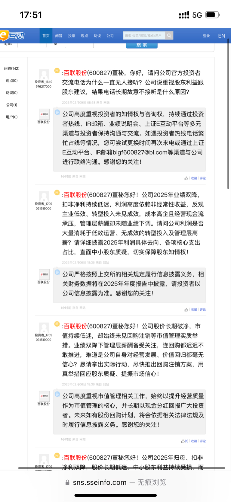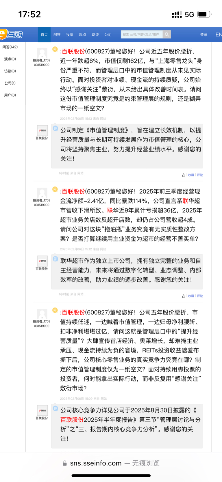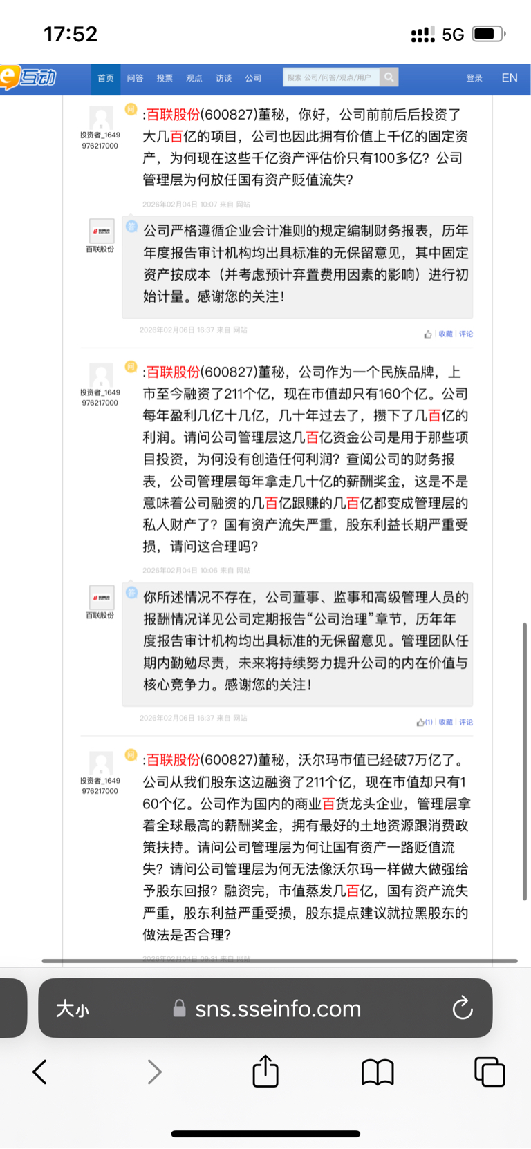$百联股份(SH600827)$ 随便截了几张图,大家也可以自己去e互动看,自始至终,就是这种玩意在提重复性的问题,每周有组织有纪律的提问,提出来的问题里的公司还会把公司搞成王府井和上港,是不是复制黏贴忘了修改,是不是收了钱针对多家公司长期发表负面信息,是不是长期在配合恶庄打压股价?这种人赚黑心钱,希望有好结果。