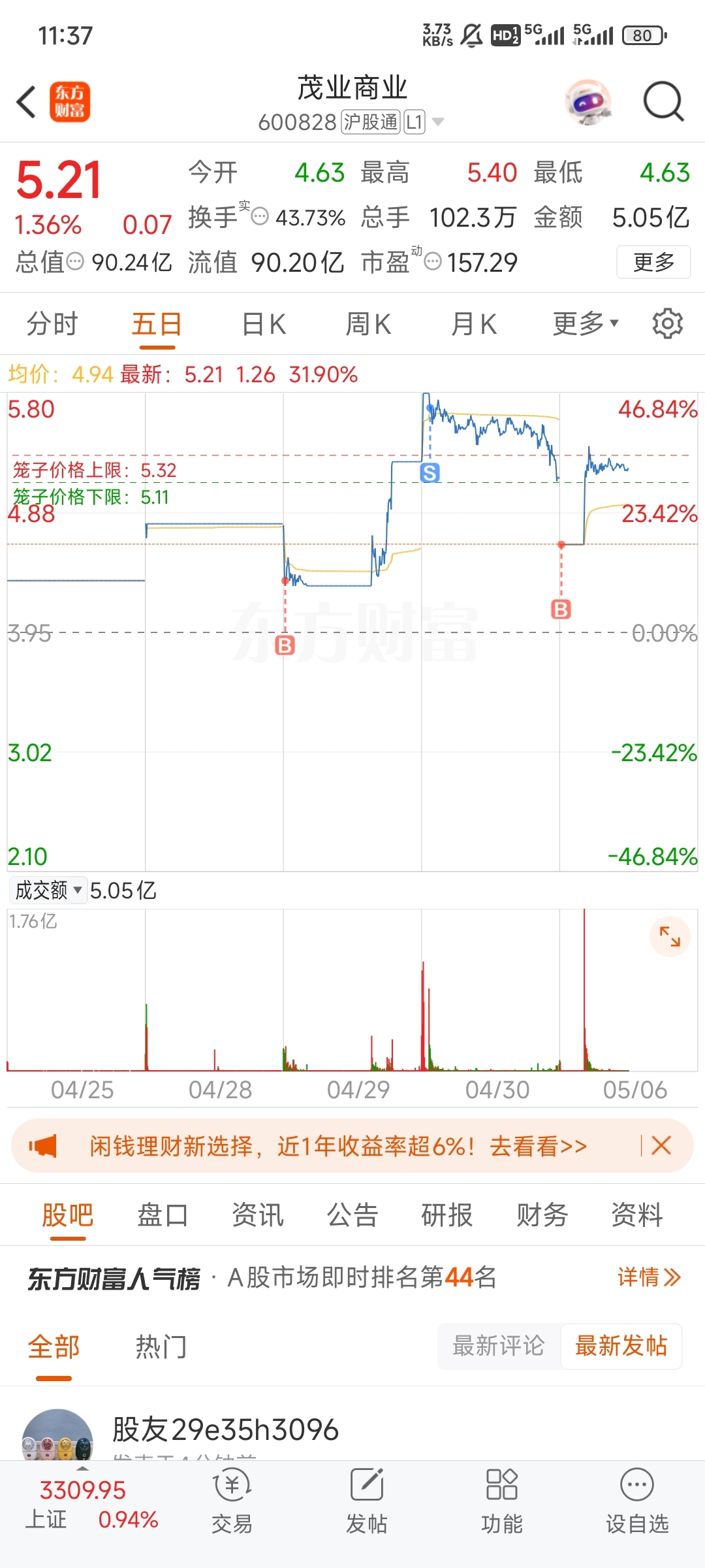 $茂业商业(SH600828)$ 开盘看国芳和步步高都开的都不错,果断回来重仓抄底,所以我就知道今天绝对会翘板,再加上五一放假这几天的情绪,大盘肯定会冲上天,