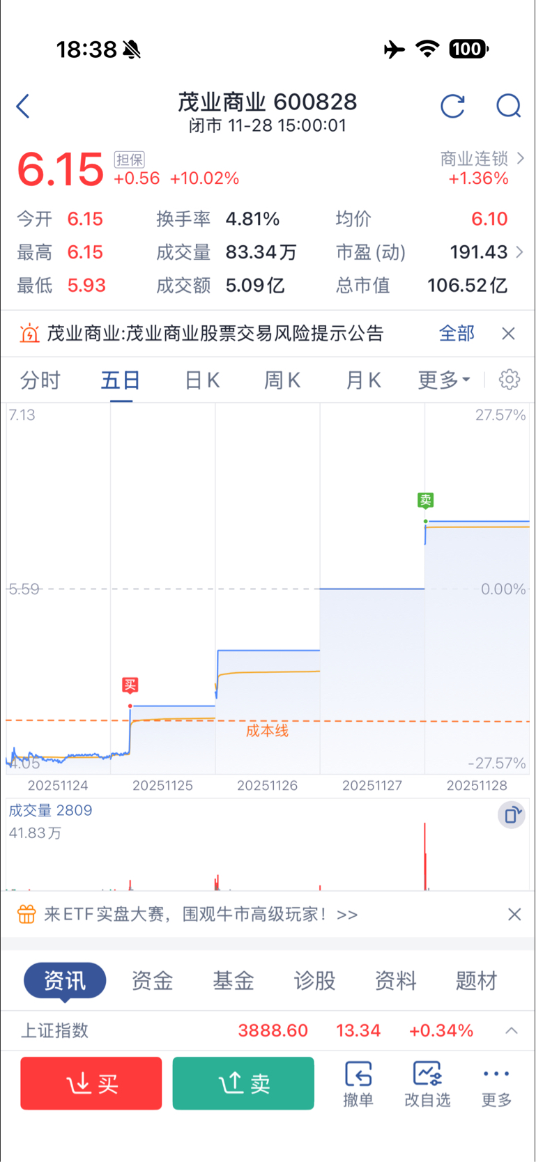 $茂业商业(SH600828)$ 爆量,周一看空,大幅震荡。落袋 35 个点,留下的发财