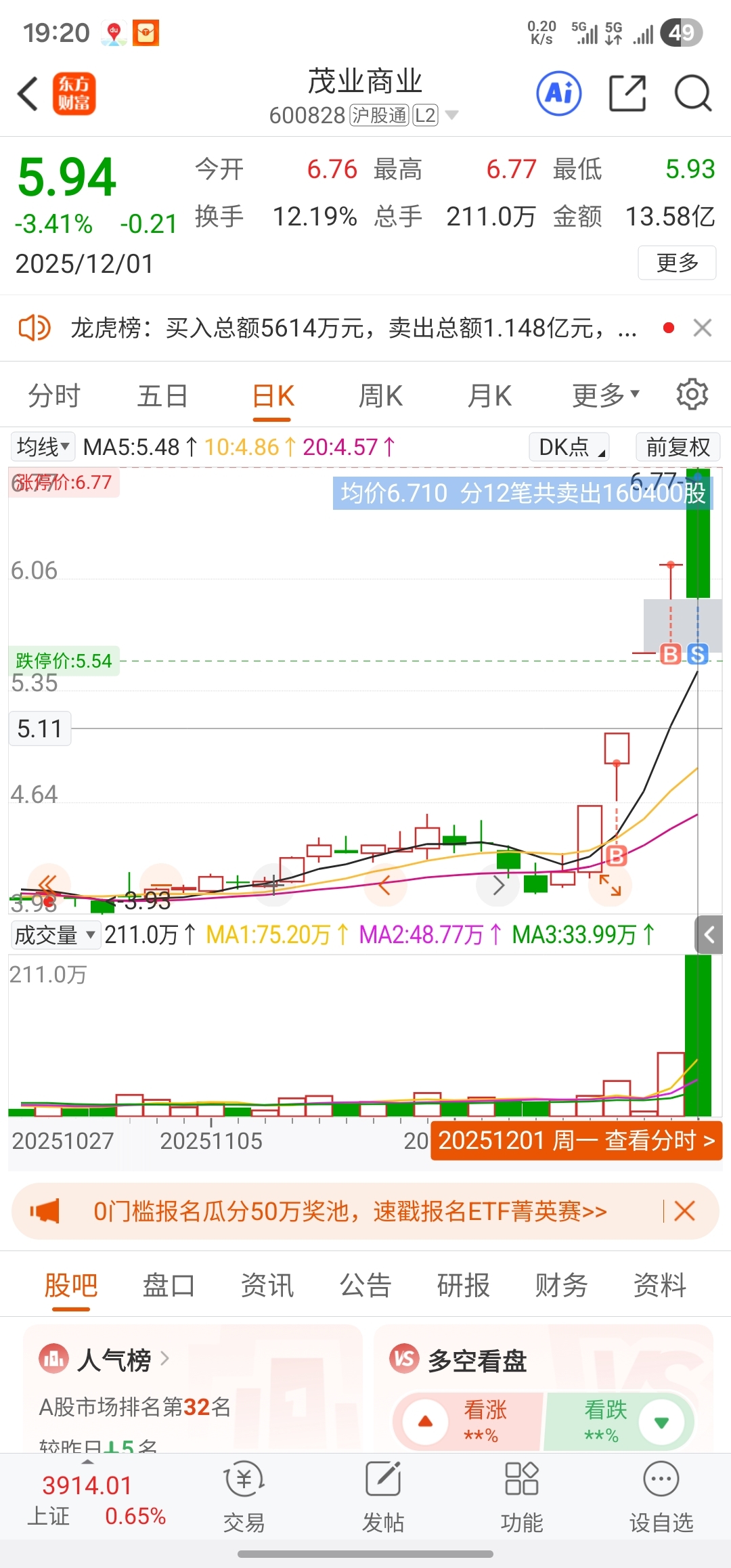 $茂业商业(SH600828)$ 简单复了下盘:今天开盘老庄竞价出货,周五进的接力资金想走一字造势,虽然竞价没封住但情绪到位了,早盘我觉得今天应该是稳的,不至于会炸板,谁想老庄不给接力资金面子,直接板上出货,导致情绪崩塌,周五进的资金只能顺势套利出逃,尾盘散户自由交易股价回落,所以今天只有卖点没有买点!