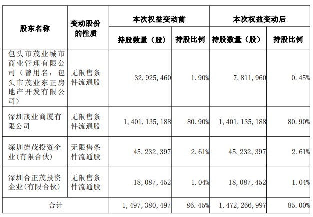 12月1日晚间, 茂业商业(600828)公告披露,公司控股股东一致行动人包头市茂业城市商业管理有限公司(曾用名:包头市茂业东正房地产开发有限公司,以下简称“包头茂业商管”)于2025年11月28日至12月1日通过集中竞价及大宗交易方式减持公司股份合计2511.35万股,占公司总股本的1.45%。本次权益变动后,包头茂业商管及其一致行动人合计持有公司股份14.72亿股,占公司总股本的85.00%,仍保持绝对控股地位。