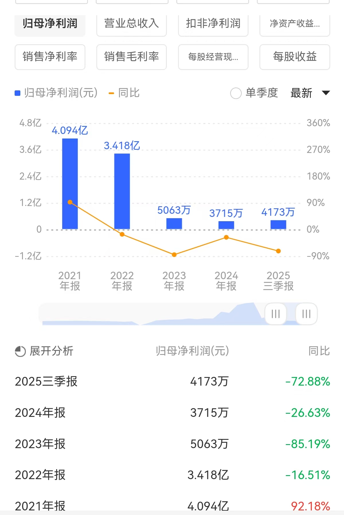 自2022年以来,公司营收、归母净利润持续下滑——营收从2021年的41.68亿元,降至2024年的27.16亿元;而净利润由2021年的4.09亿元,下滑至2024年的仅3715万元,四年间骤降约九成。