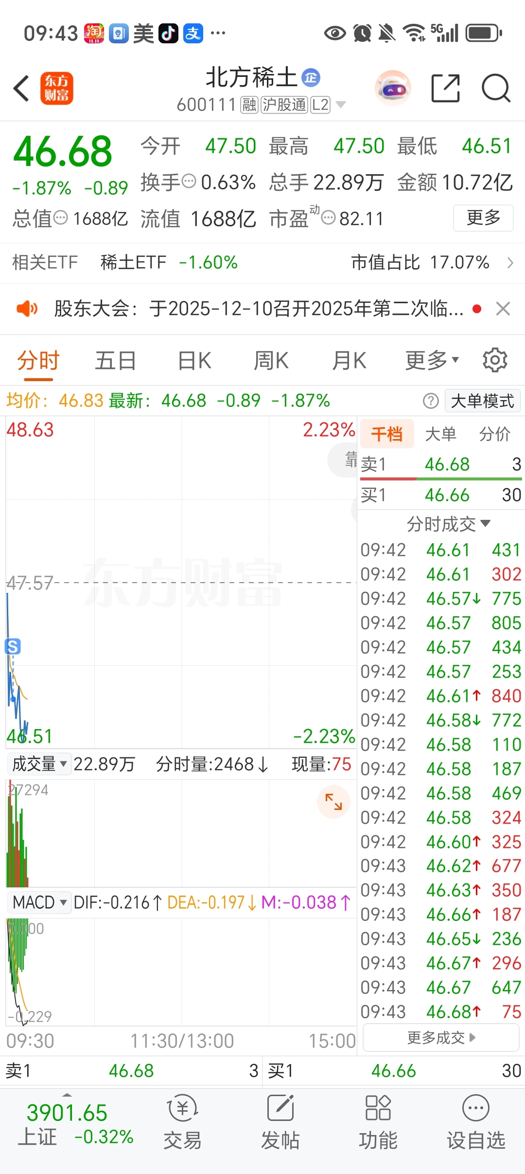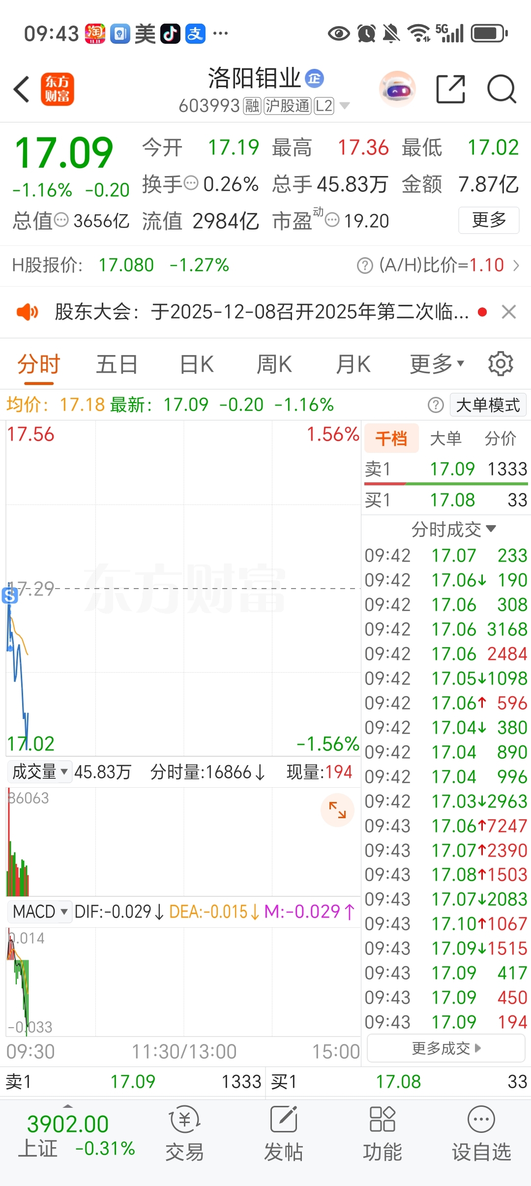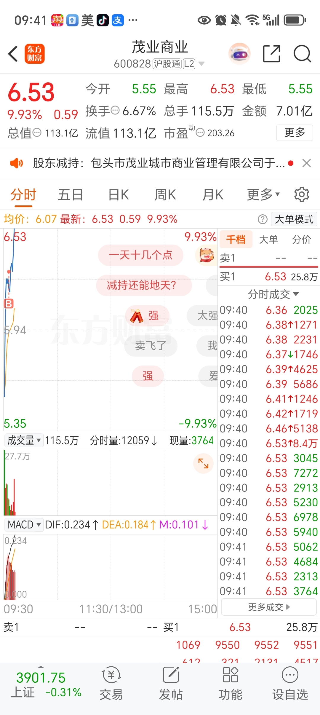,全仓清了北方稀土洛阳钼业进了一半茂业商业,准备找有色金属低点再进去,现在先不着急进