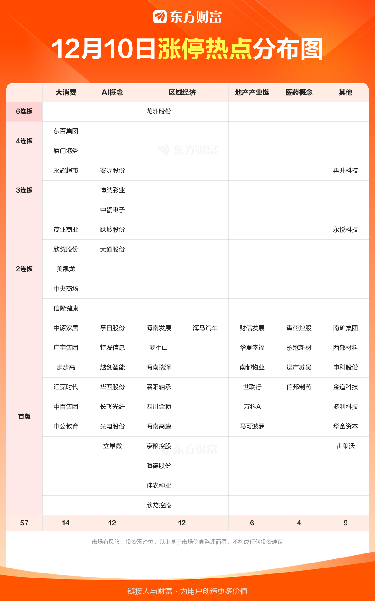 1 海南自贸 海南自贸港将于12月18日全岛封关运作,政策红利预期推动板块大涨。 相关个股:$神农种业(300189)$、$康芝药业(300086)$、$欣龙控股(000955)$、$罗牛山(000735)$、$海马汽车(000572)$ 2 VC概念 储能需求爆发推动碳酸锂消费结构转变,价格中枢有望上移,带动锂电相关产业预期提升。 相关个股:$孚日股份(002083)$(4天2板)、$华盛锂电(688353)$、$富祥药业(300497)$、$永太科技(002326)$、$奥克股份(300082)$ 3 贵金属 美联储12月降息预期升温,市场普遍预计将降息25个基点,推动贵金属价格上涨。 相关个股:$晓程科技(300139)$、$湖南白银(002716)$、$山金国际(000975)$、$招金黄金(000506)$、$四川黄金(001337)$ 4 商业百货 政治局会议明确扩大内需战略部署,政策面强力刺激消费市场预期 相关个股:$永辉超市(601933)$(3天3板)、$中央商场(600280)$(2天2板)、$美凯龙(601828)$(2天2板)、$茂业商业(600828)$(12天7板)、$东百集团(600693)$(4天4板) 5 CPO概念 英伟达获准向中国出售H200芯片,带动国产GPU企业股价联动 相关个股:$华西股份(000936)$、$长飞光纤(601869)$、$天通股份(600330)$(2天2板)、$跃岭股份(002725)$(2天2板)、$永鼎股份(600105)$市场热点