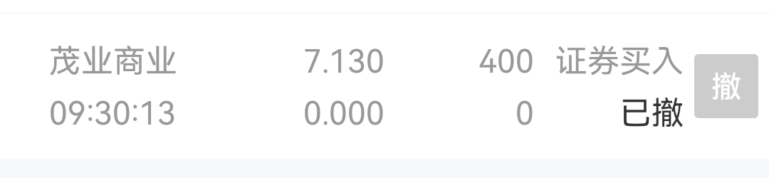$茂业商业(SH600828)$ 为什么9:30:13提交的订单,没有成交呢