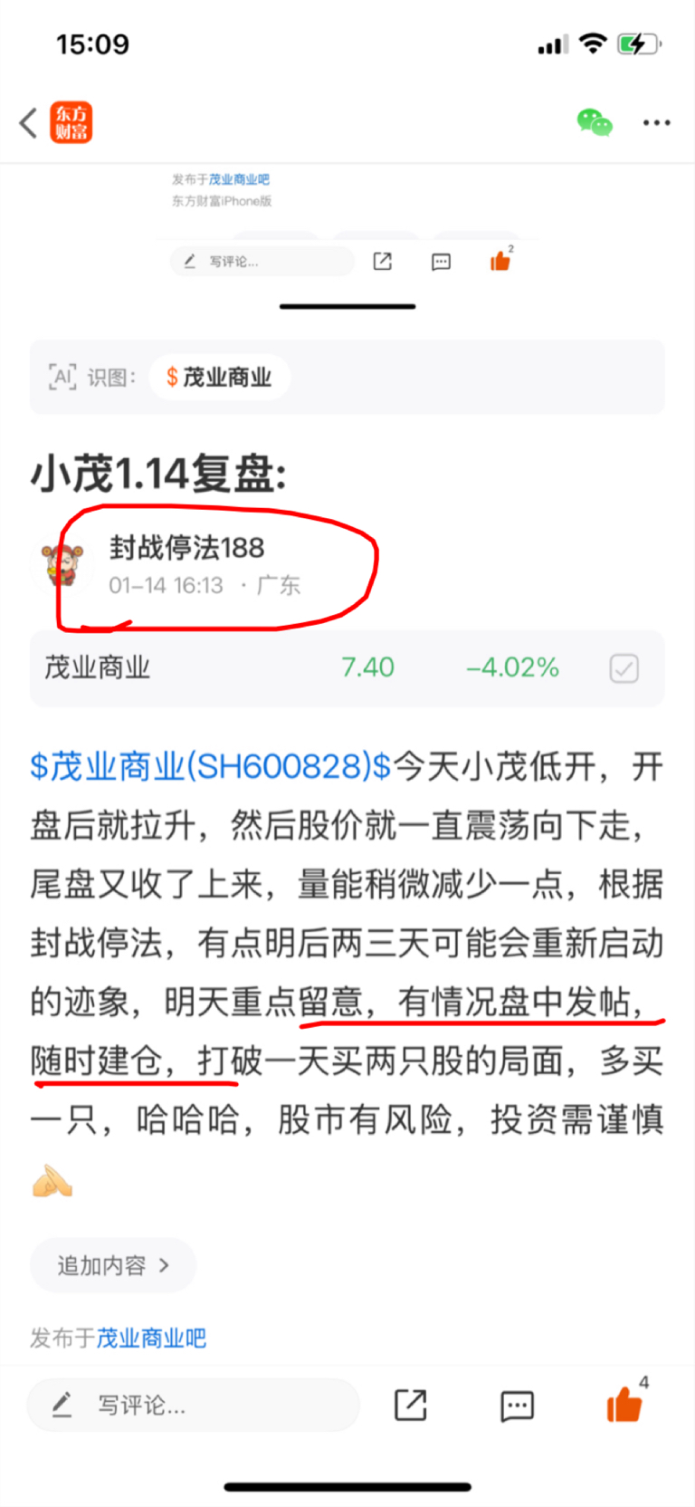 $茂业商业(SH600828)$ 小茂今天一开盘很快就小幅拉高然后就回落,一个早上股价都在远离生命线下震荡,下午一开盘又来了个急拉,然后又回落,尾盘股价又稍微有所回升,一天的量能大大减少,主力出货的可能性比较小,今天还是没建仓,明天继续观察(有情况盘中发帖),股市有风险,投资需谨慎
