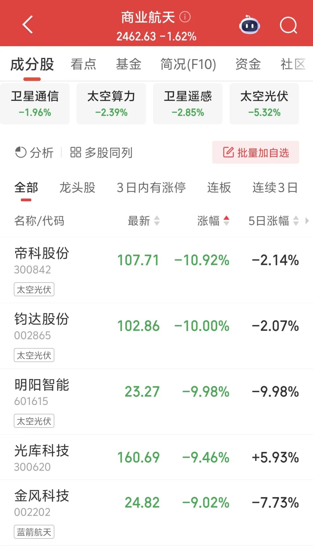 此外,电网设备、油气等板块跌幅居前,太空光伏概念大幅回调。