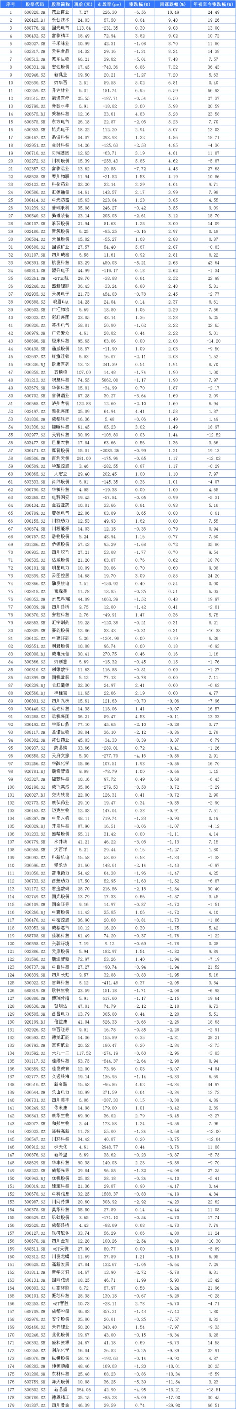 数据显示,179家四川A股,其中收涨85家,收平3家,收跌91家。