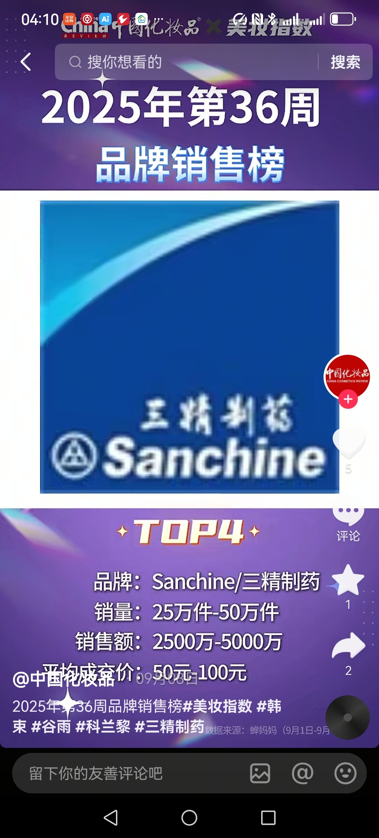 $人民同泰(SH600829)$ 中国化妆品网第36周排名第四