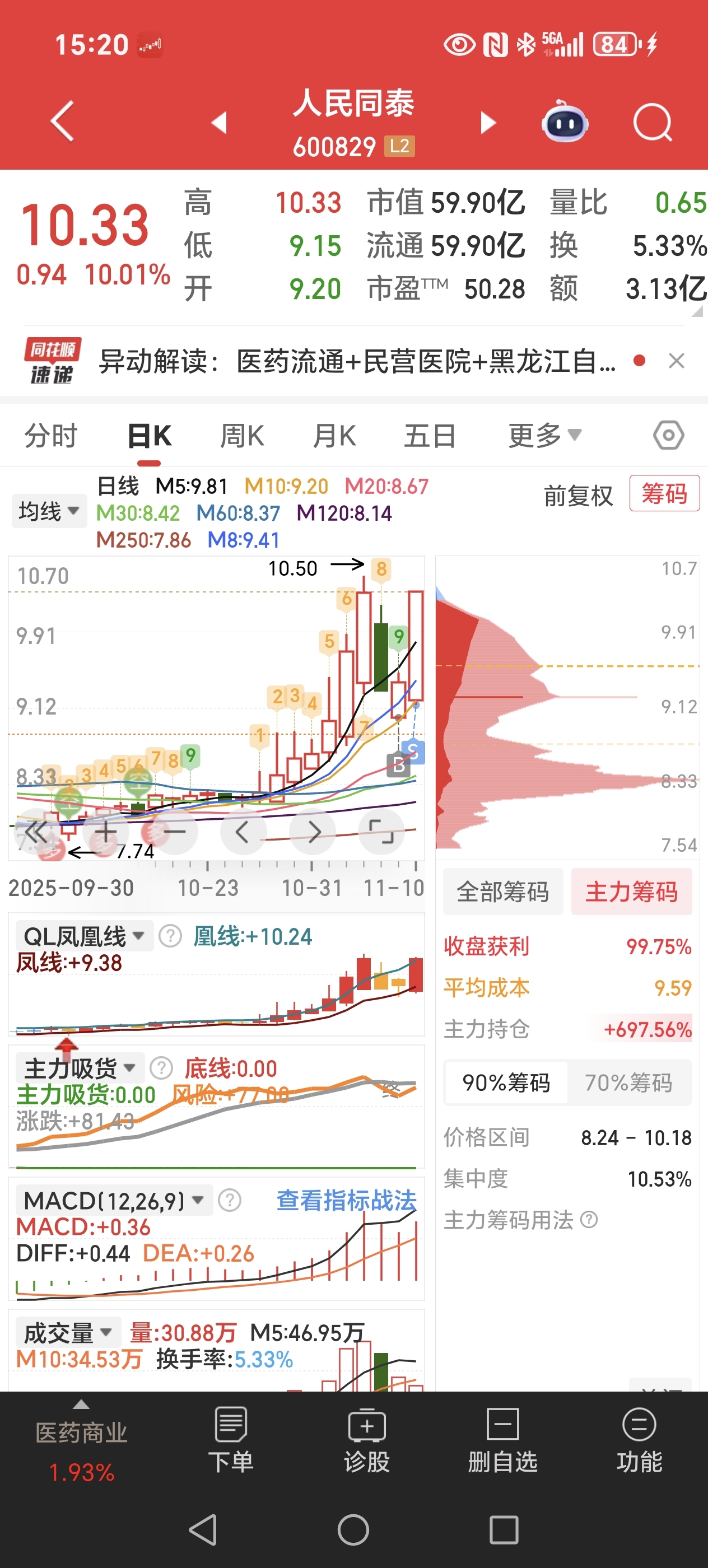 $人民同泰(SH600829)$ 这个还剩不到一成仓,底部筹码还没动继续拿着