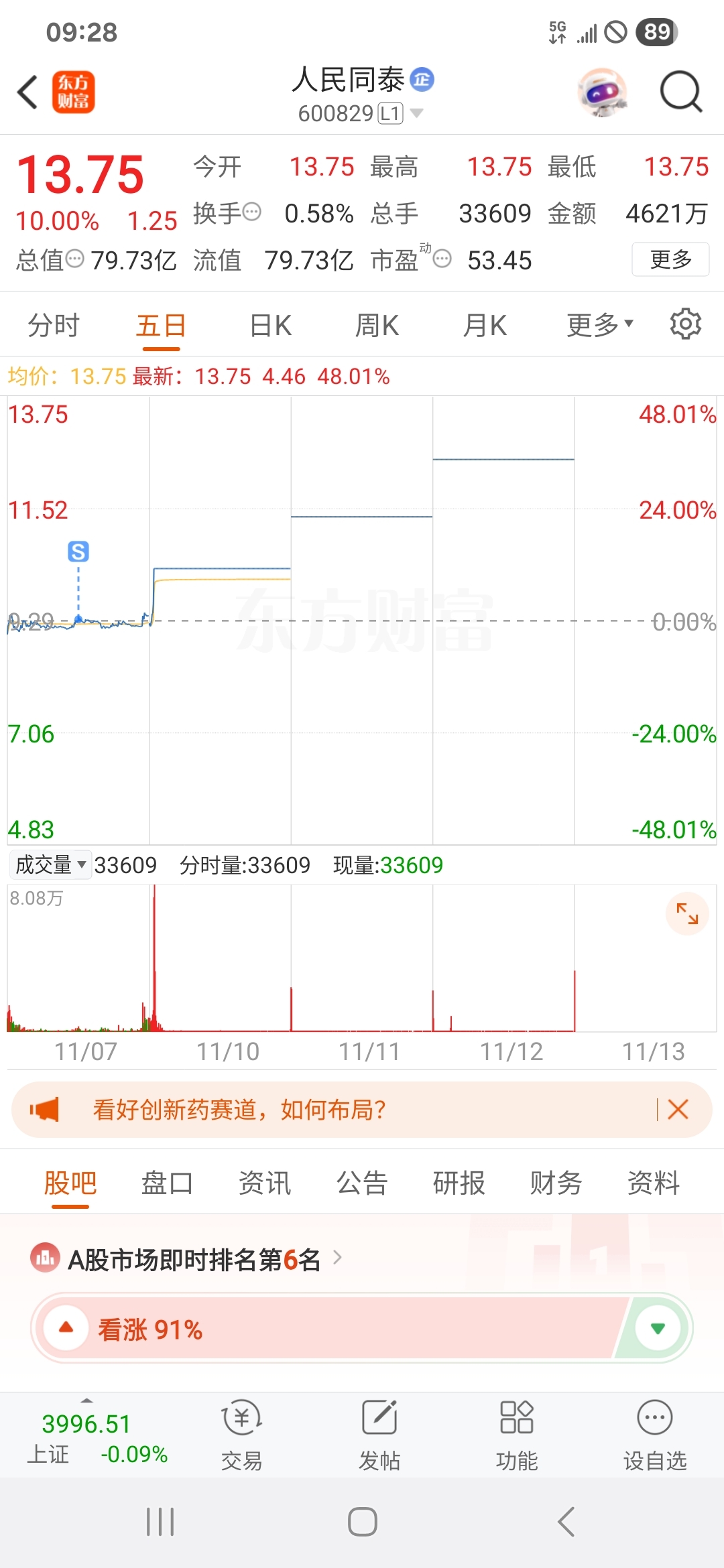 $人民同泰(SH600829)$