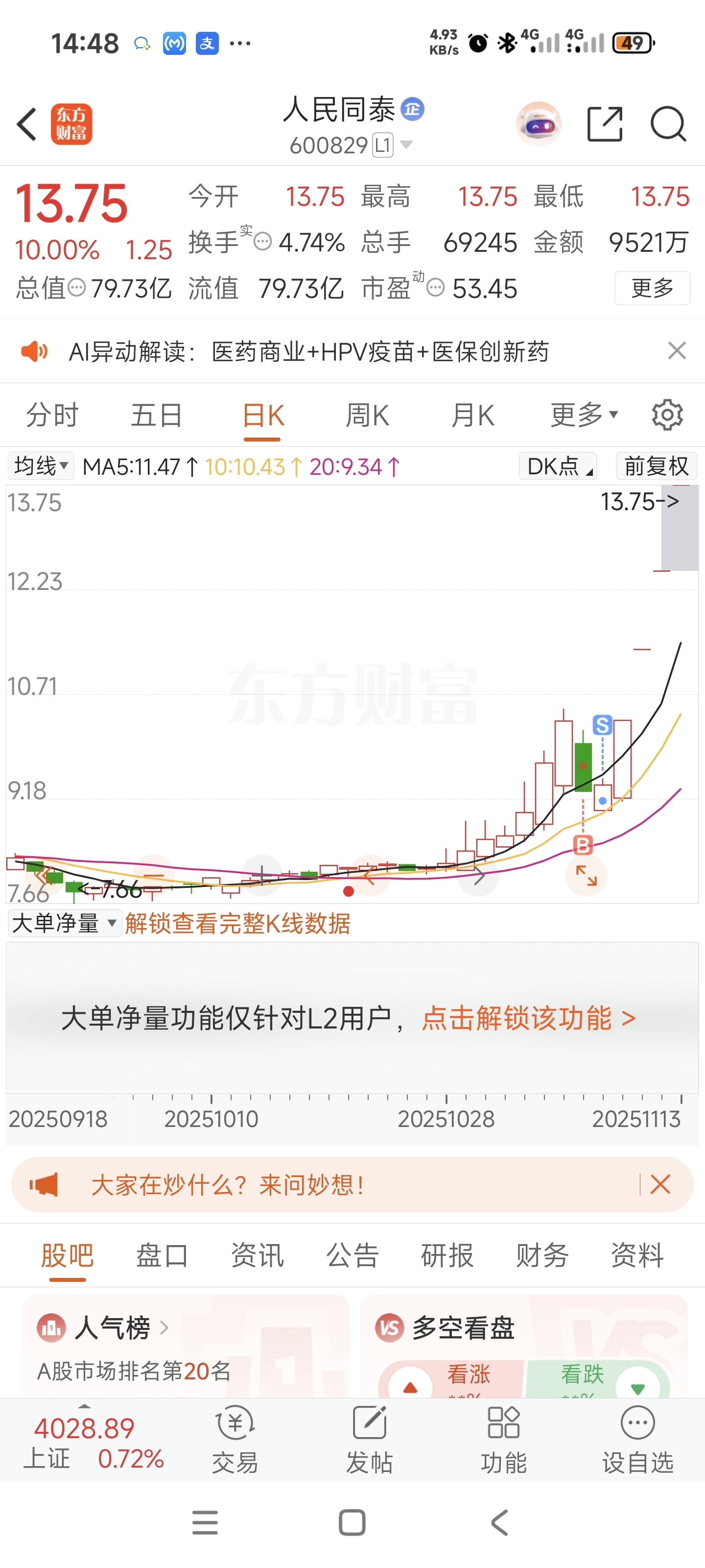 $人民同泰(SH600829)$