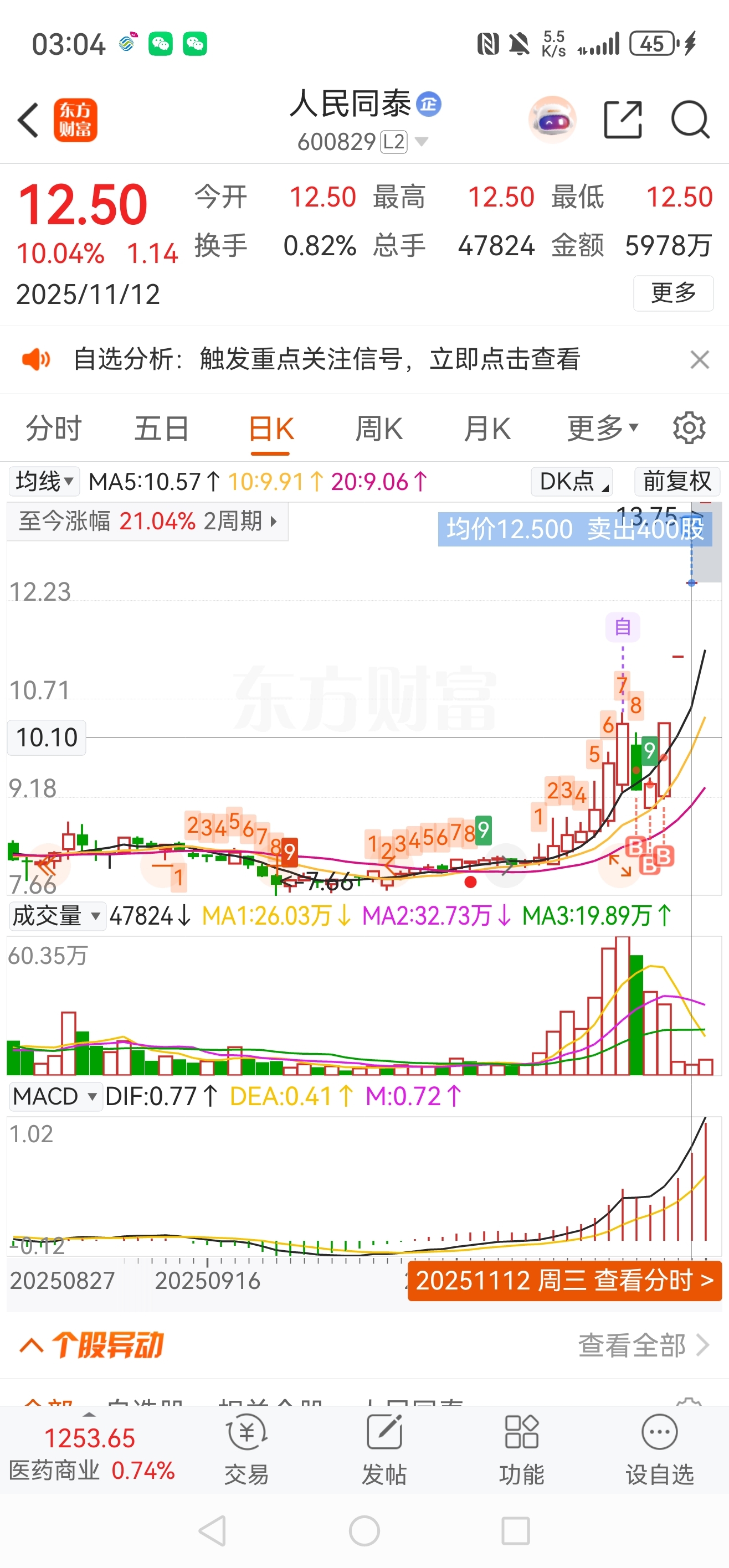 $人民同泰(SH600829)$ 昨天卖了400股,让哪个兄弟接住了