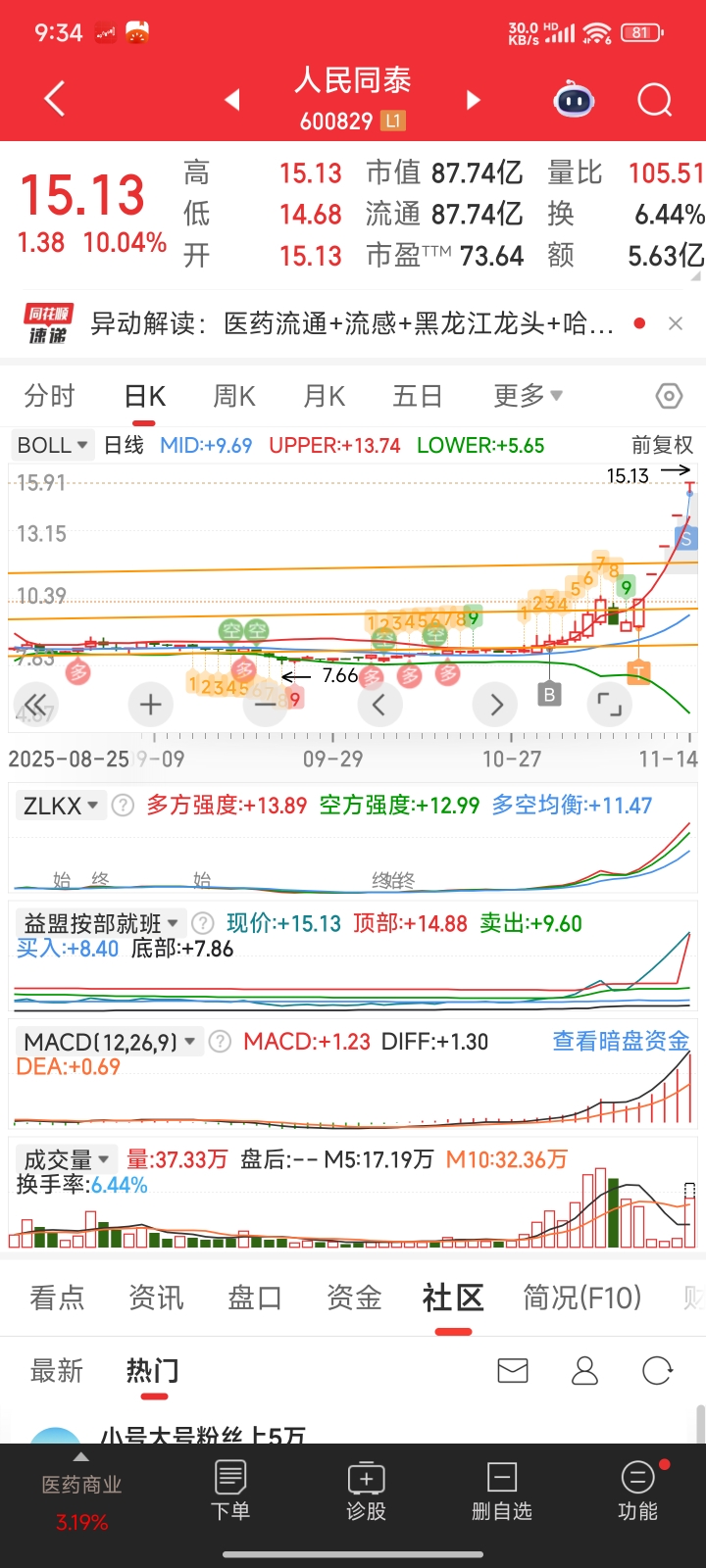 $人民同泰(SH600829)$ 大盘起来了,我先走了