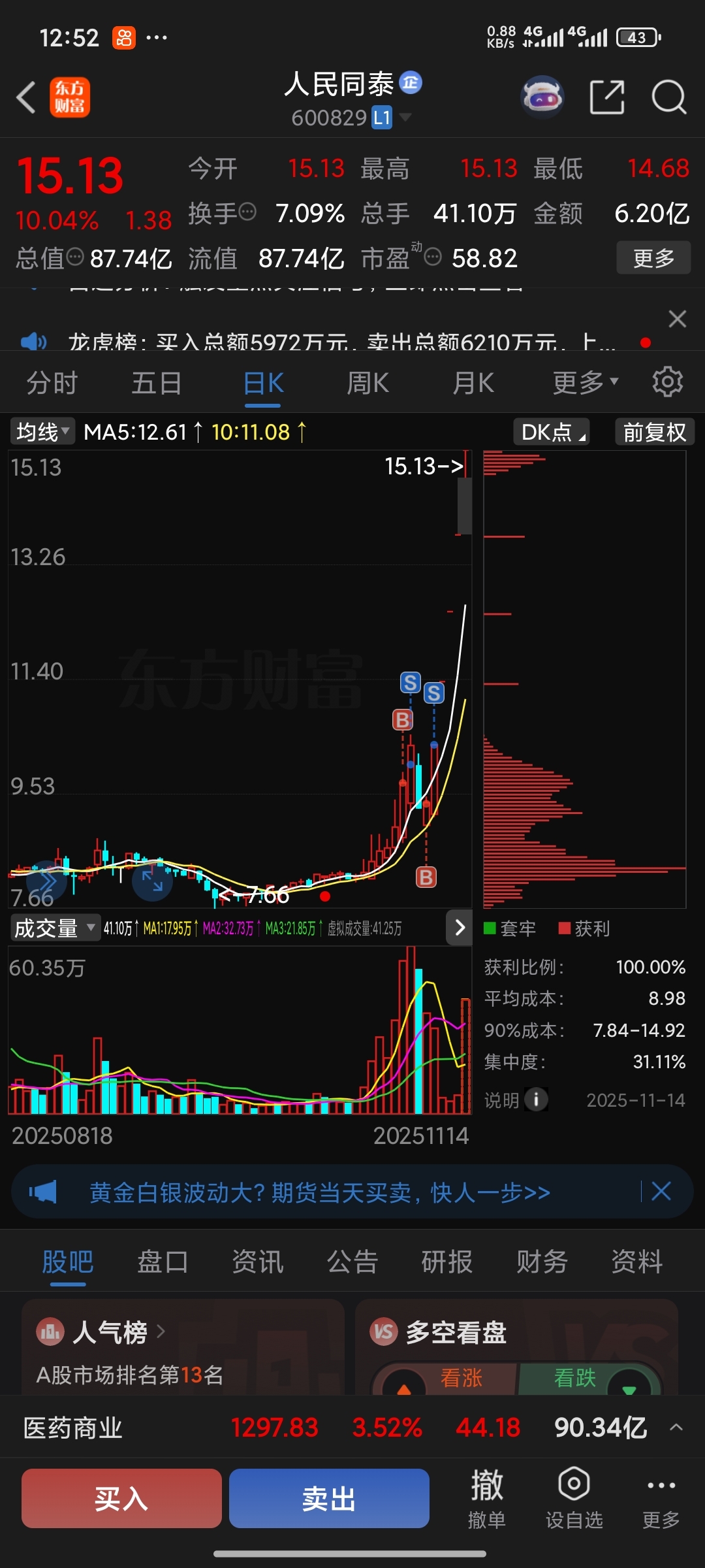 $人民同泰(SH600829)$ 草了老子错过大肉,我可是满仓进的