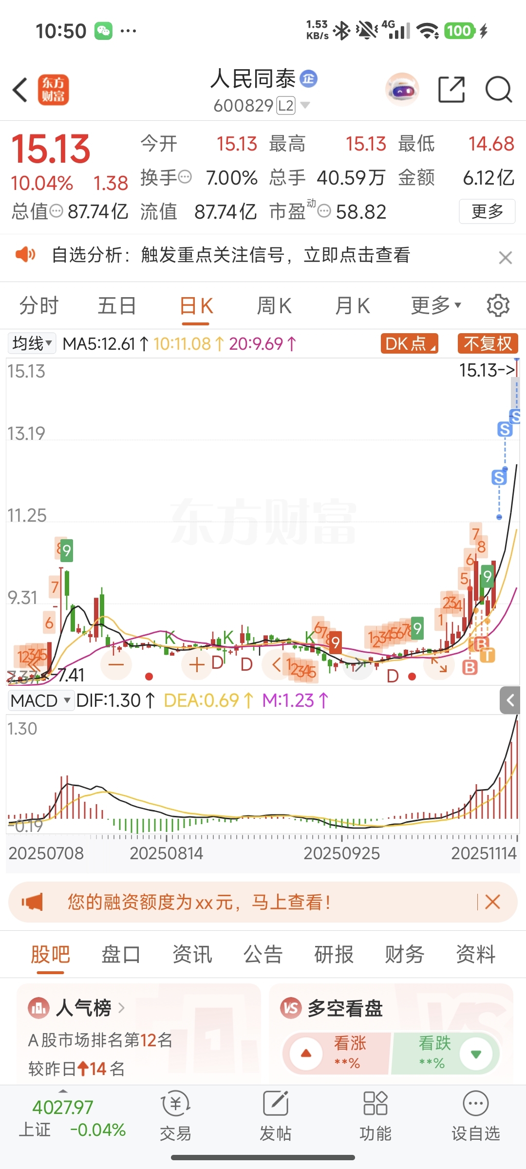 $人民同泰(SH600829)$ 也不知道这个决定是对还是错。每天板上都出一部分。我给你们货了,买不买得到,就是你们的事了
