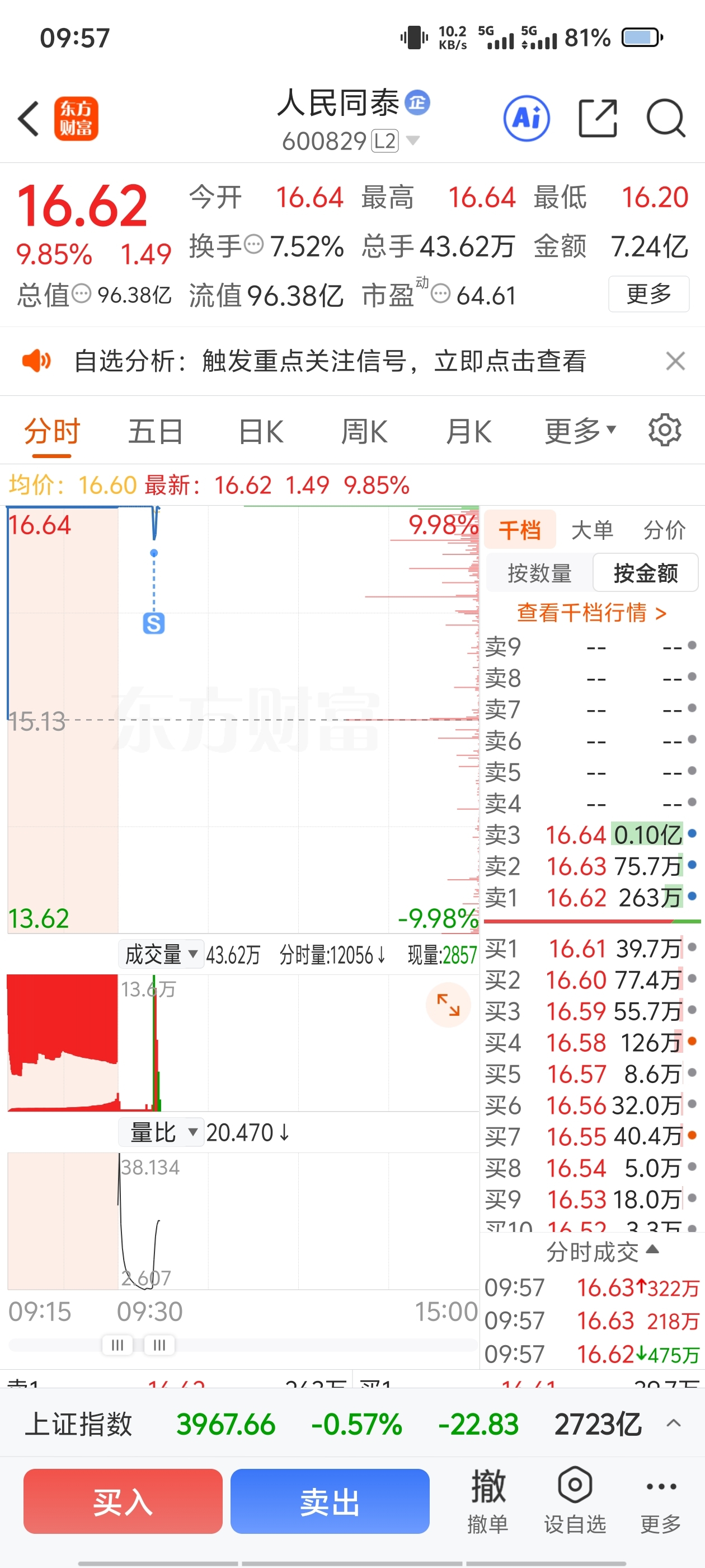 $人民同泰(SH600829)$ 我吃着早饭,这条件单给我整的笑了一下