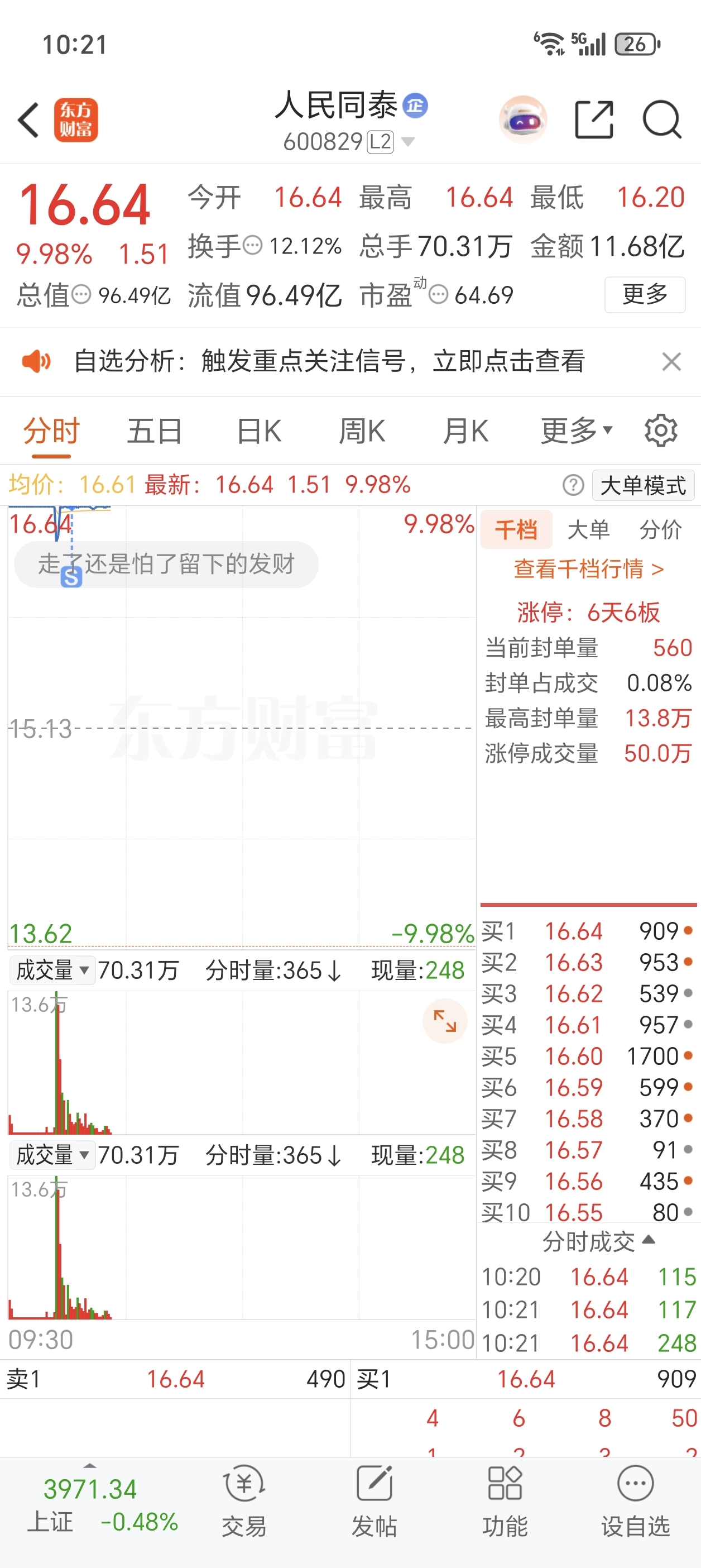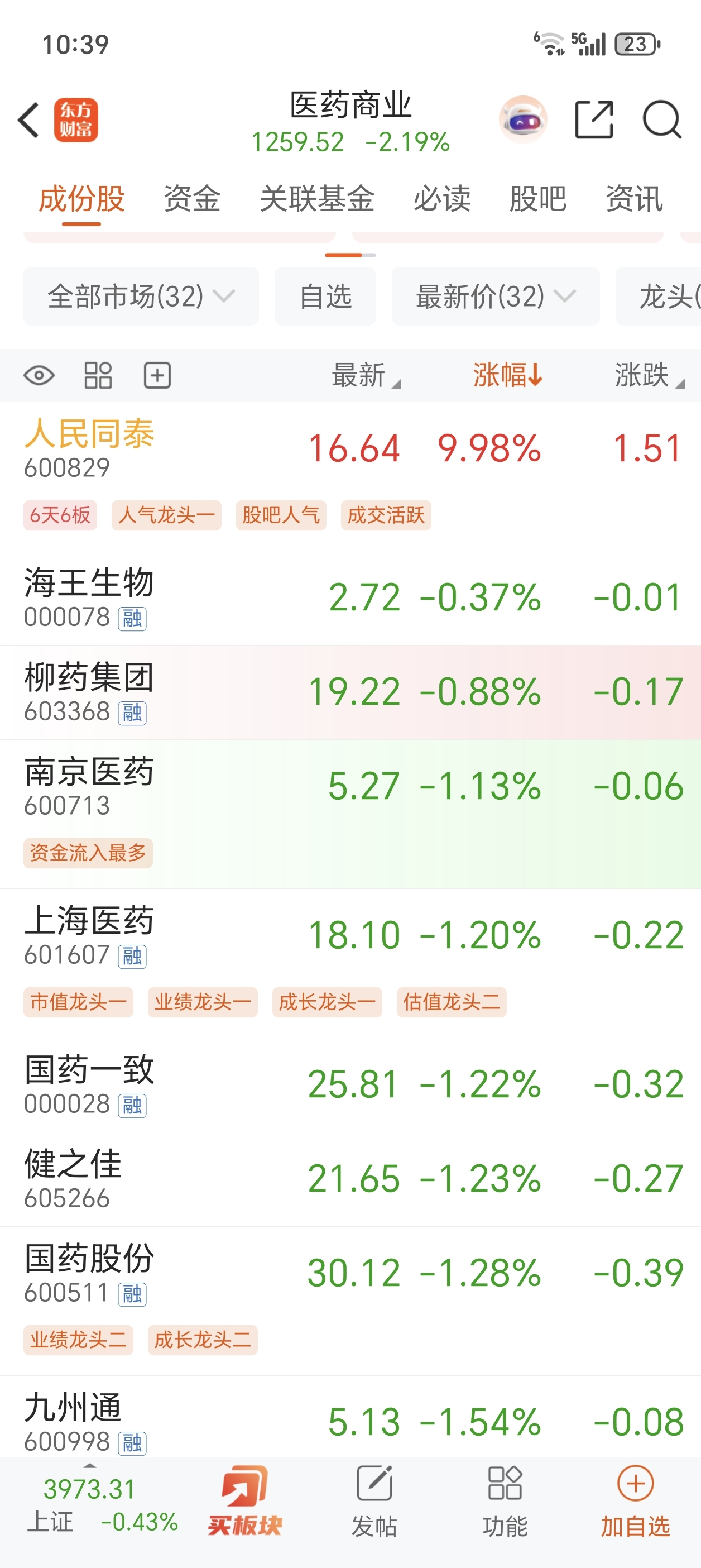 天呐,完全是板块的独立行情啊,这就是龙头股吗?整个板块都在跌,人民同泰扛大旗,我
