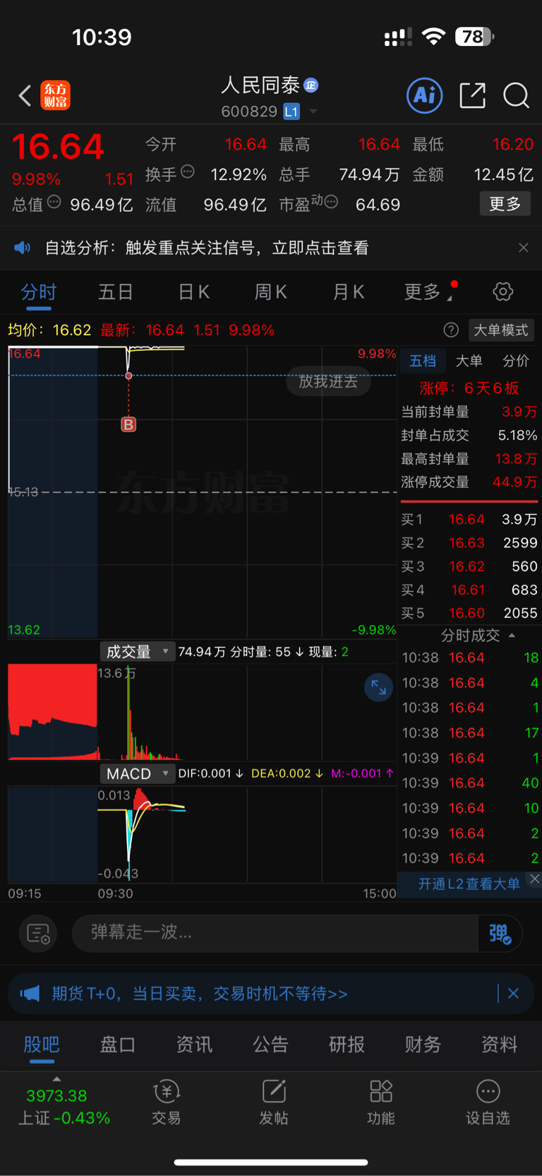 $人民同泰(SH600829)$ 进去了明天会不会跌停
