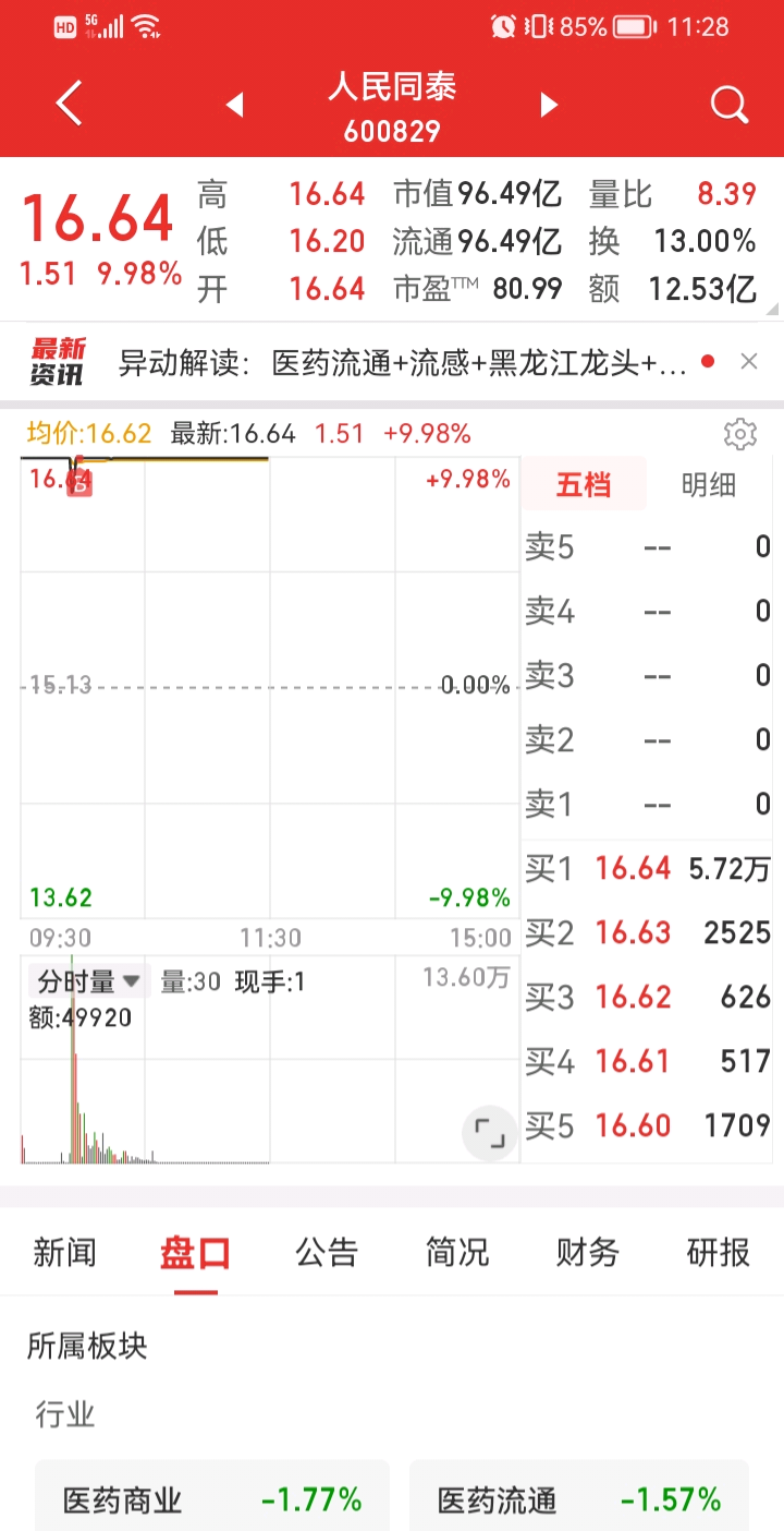 $人民同泰(SH600829)$ 合富停牌了,今天平潭,孚日,同泰,华夏,航天发展等等热门龙头反而全部一字板涨停