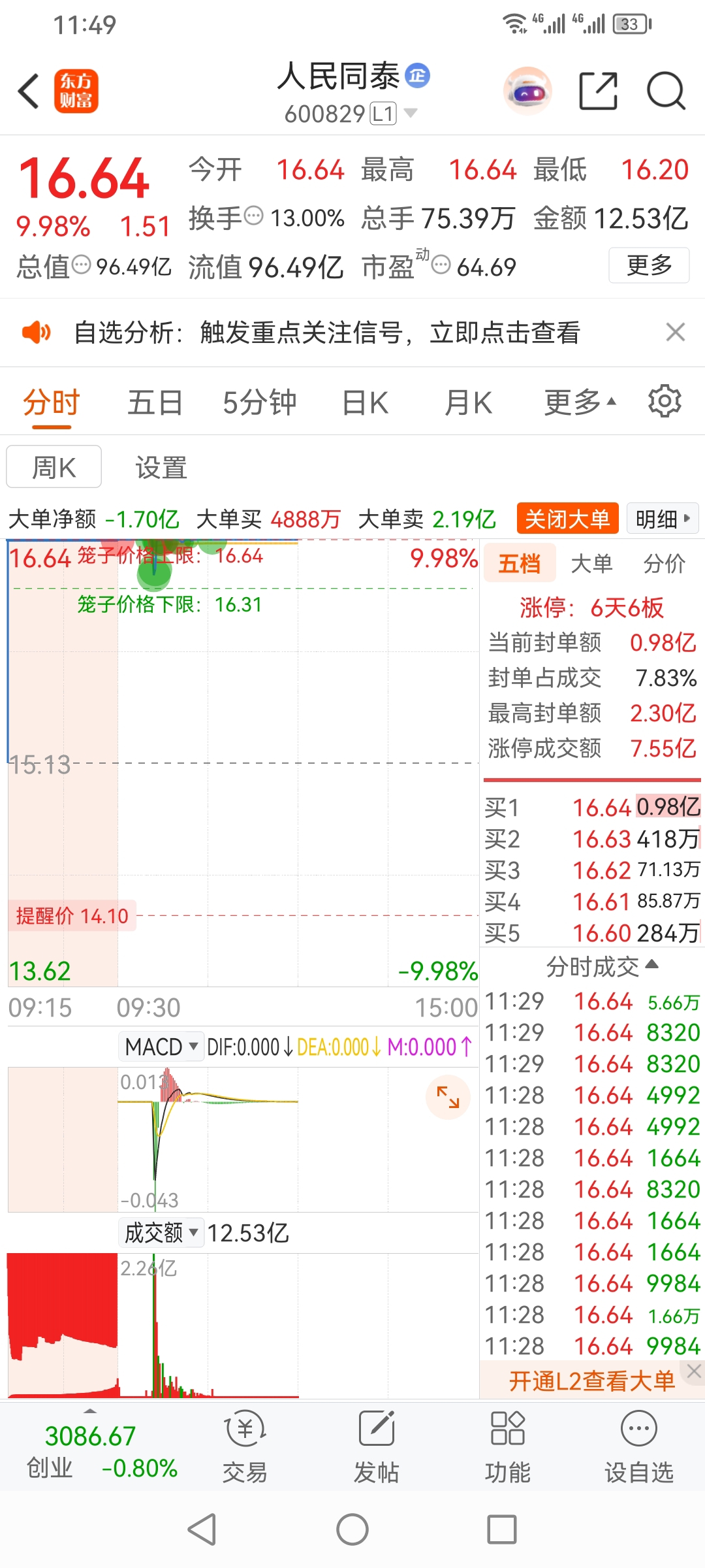 方军,今天操盘人民同泰,放量涨停板。