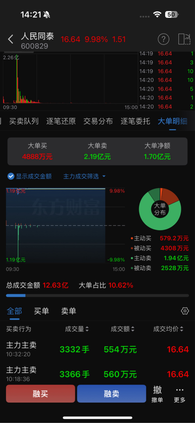 $人民同泰(SH600829)$ 从炸板的那一瞬间主力出逃了1.19亿 明天可能是暴风雨的开始 今天应该是散户最后的狂欢了