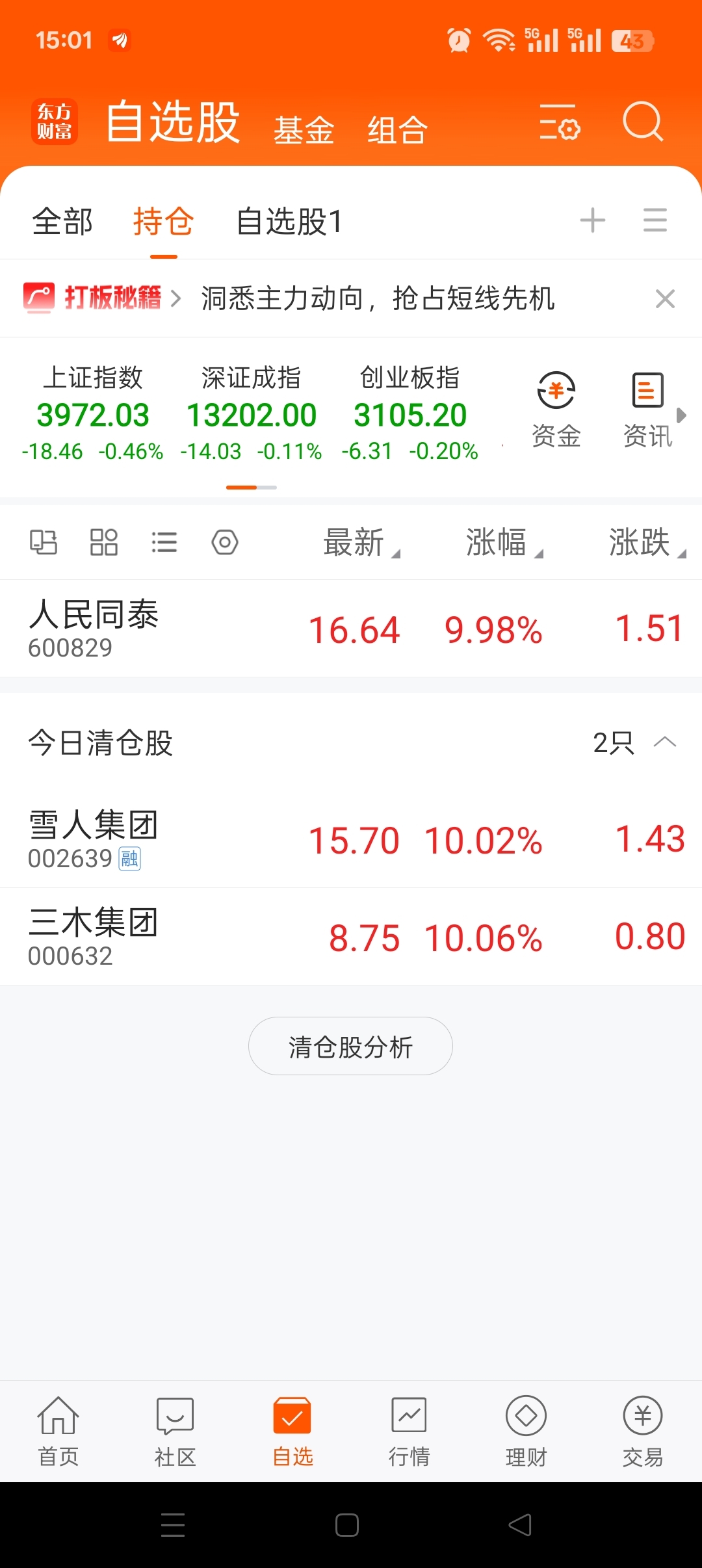 $人民同泰(SH600829)$ 有多少人和我一样,赌它回封的。希望明天有溢价,卖掉三木和雪人。今天收获满满