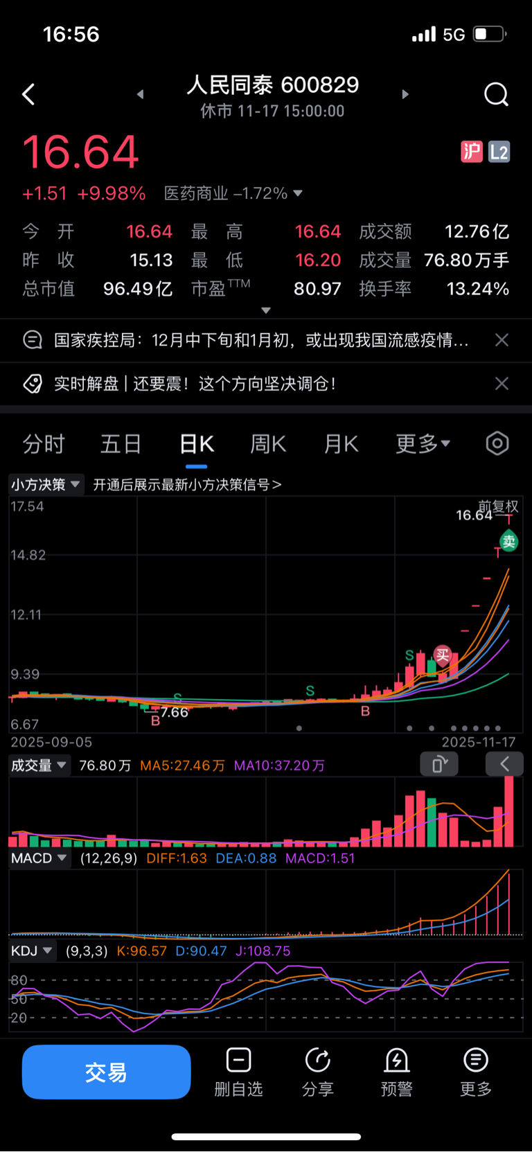 $人民同泰(SH600829)$ 从明天开始就没有稳定收益了!虽然是跨年妖,但我的认知就是6个板!谢谢你给我创伤的心灵与以慰藉!剩下的靠新来的跟继续博弈的你们了!