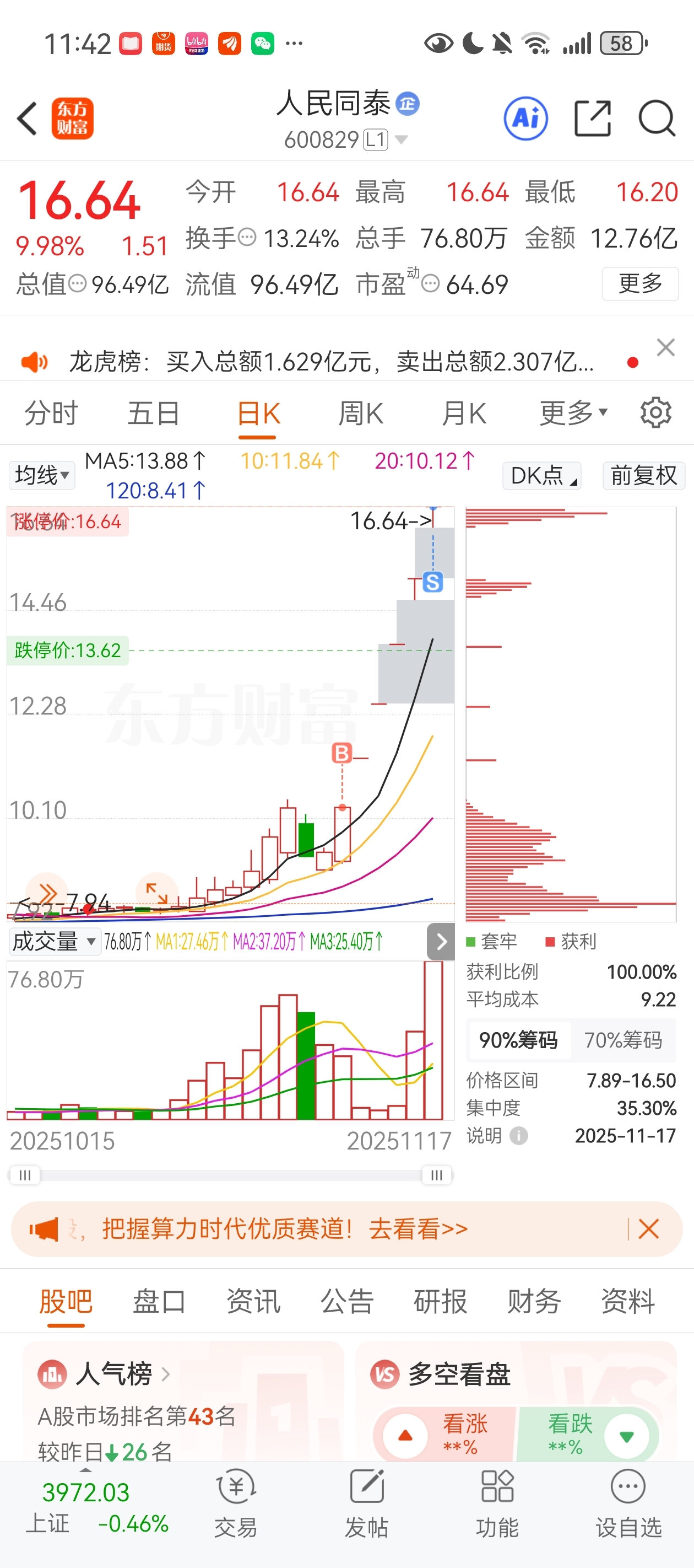 $人民同泰(SH600829)$