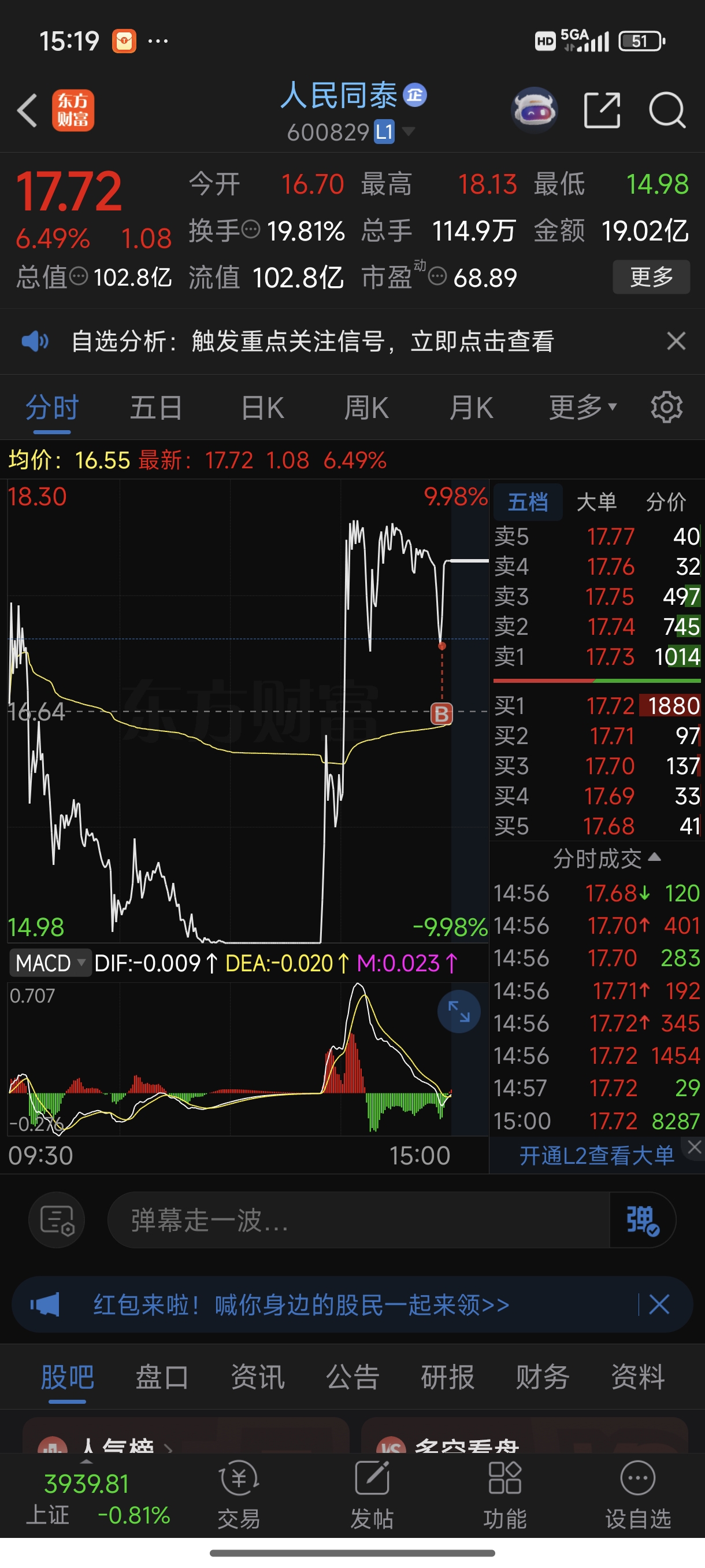 $人民同泰(SH600829)$ 跌停没敢买,尾盘追上了