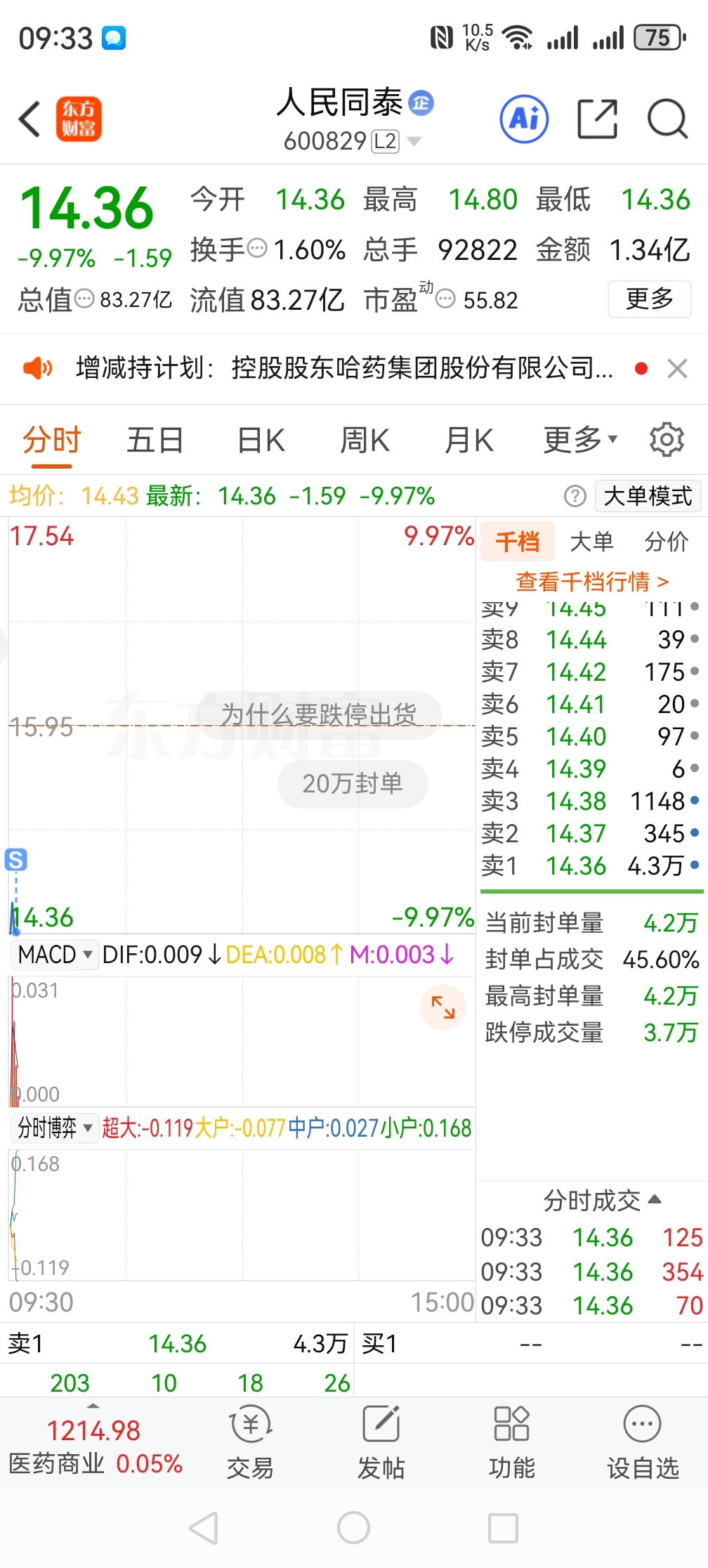 $人民同泰(SH600829)$ 不抱有幻想,地天板我也不后悔,这时候减持今天跌停了话,明天还得来个跌停