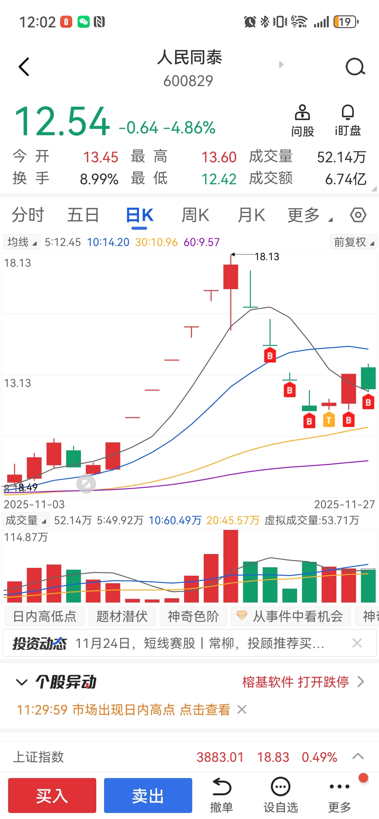 $人民同泰(SH600829)$ 万一今天下午是放量涨停了,那突破前高是必然的,如果无力反抽,那后续确实是下跌趋势,搏一搏单车变法拉利