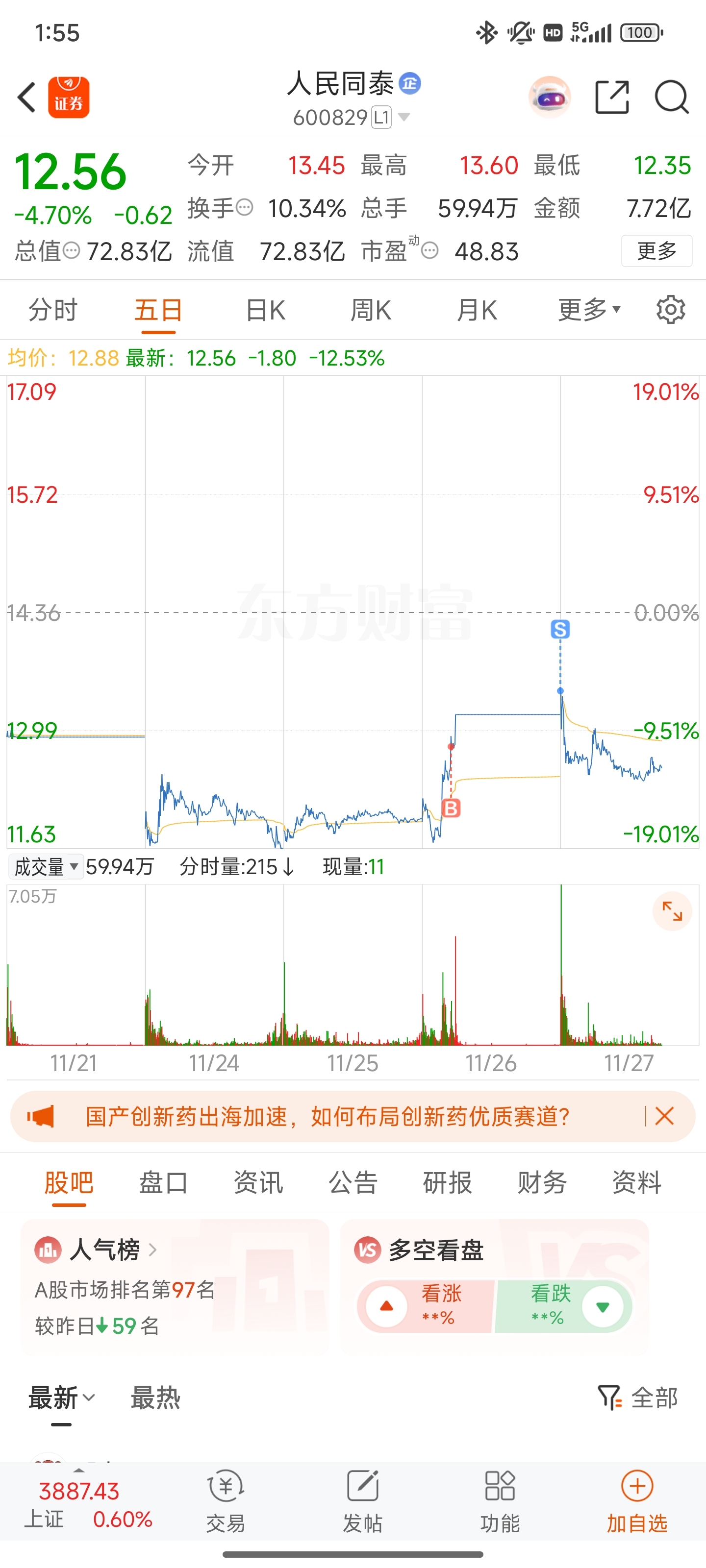 $人民同泰(SH600829)$ 看我如何收割你们这些韭菜
