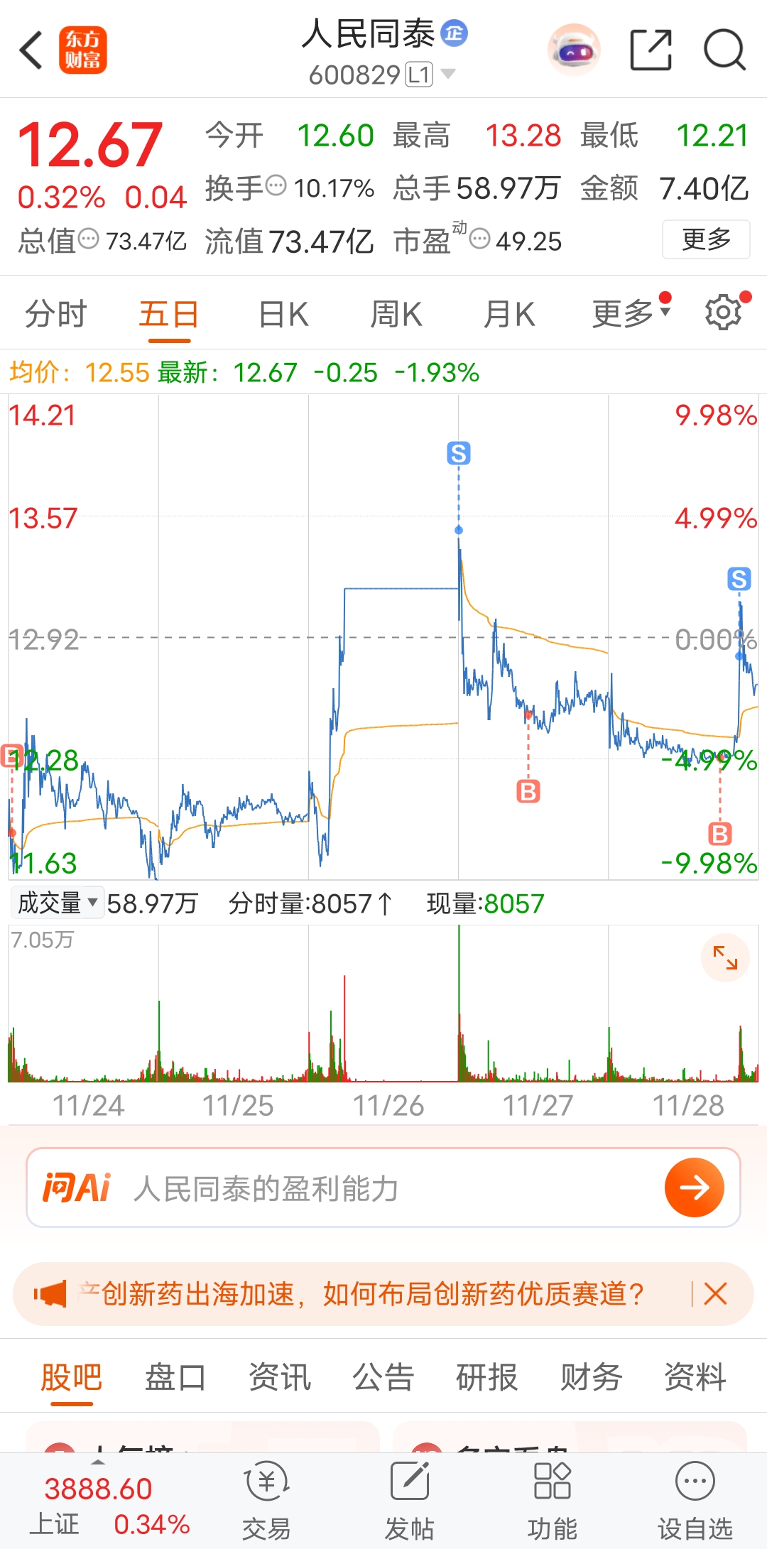 $人民同泰(SH600829)$ 这个踢能看一点点