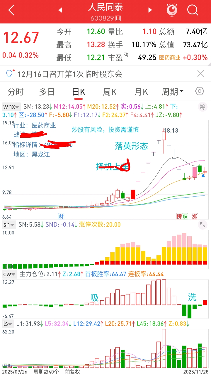 $人民同泰(SH600829)$ 很多人喜欢抄底,那么落英k线形态是很适合的。落英k线是指近期有连板,股价跌至20日均线处。sn持续水上强势,cw开始反转向上。