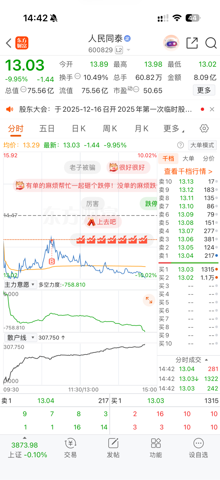 $人民同泰(SH600829)$