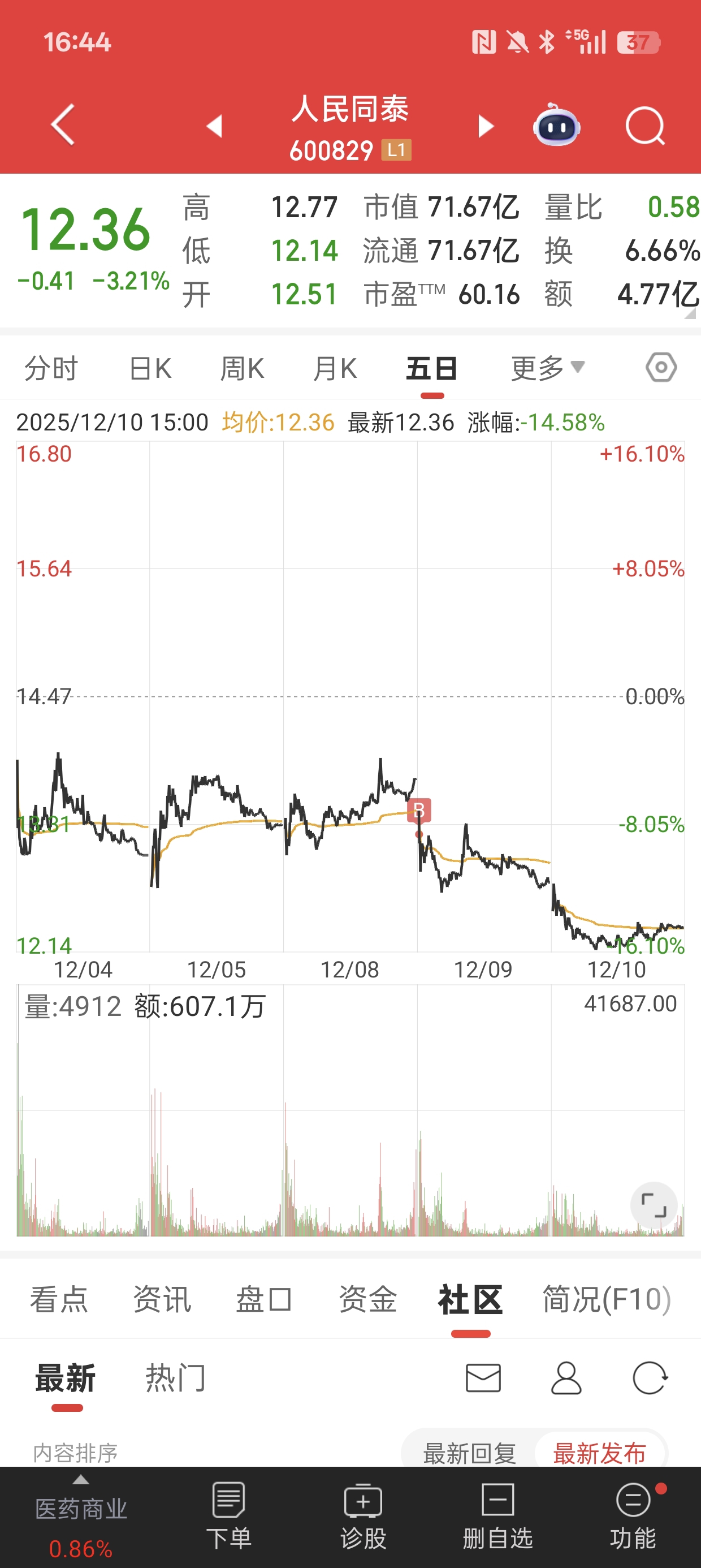 $人民同泰(SH600829)$ 两天亏我6个点走了走了,哎看错你了,连续两天缩量,后面可能涨,但不是自己的模式了,祝留下的发财
